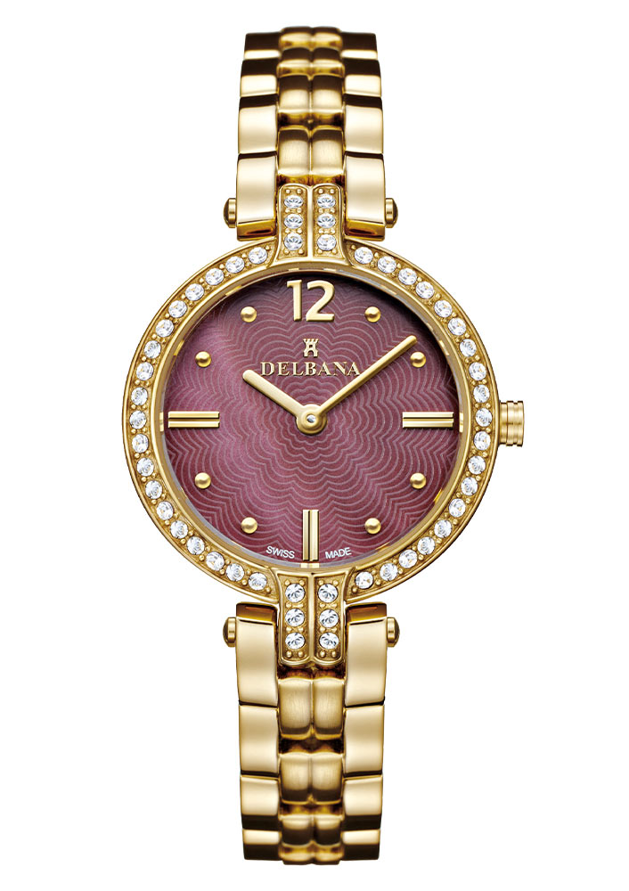 Tento model je chráněn safírovým sklíčkem, které je těžké poškrábat. Pokrývá efektní hnědý perleťový číselník zdobený květinovou gilošou. Design ciferníku hodinek Delbana je absolutní poctou estetice. Elegantní hodinové a minutové ručičky a aplikované indexy dotvářejí celek a vytvářejí hodinky, které nejen ukazují čas, ale také tvoří jedinečný šperk. Náramkové hodinky Delbana pohání švýcarský mechanismus Ronda Swiss Made.