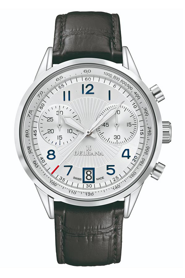 Delbana Retro Chronograph 41601.672.6.064 jsou hodinky vysokého standardu za dostupnou cenu. Je vybaven funkcemi, které uživateli umožní šířeji a radostněji se orientovat v čase a také jej podrobit různým měřením. V samotném středu jsou samozřejmě svítící náznaky, v tomto případě o typu meče. Nalevo od nich je naleštěné 30minutové počítadlo stopek. Pravý subciferník je naopak sekundová. Ve spodní části je k vidění exkluzivní logo Delbana s legendární hradní věží a ještě níže - velké datumové okno v tmavě modrém rámu na pozici 6. hod. Všechny tyto prvky kromě okna s dnem měsíc, jsou namontovány na velkolepém segmentu gilošovaného disku.