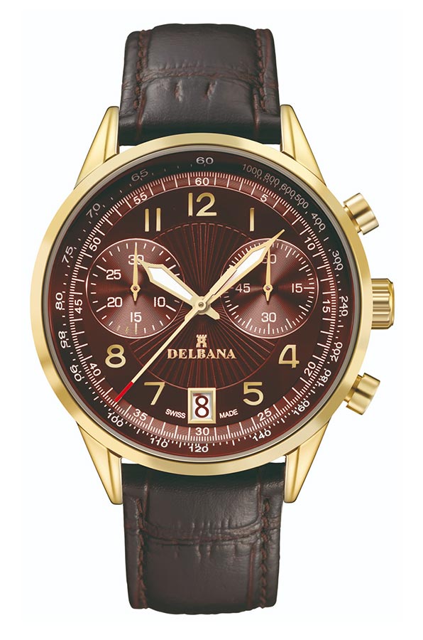 Delbana Retro Chronograph 42601.672.6.104 jsou hodinky vysokého standardu za dostupnou cenu. Je vybaven funkcemi, které uživateli umožní šířeji a radostněji se orientovat v čase a také jej podrobit různým měřením. V samotném středu jsou samozřejmě svítící náznaky, v tomto případě o typu meče. Nalevo od nich je naleštěné 30minutové počítadlo stopek. Pravý subciferník je naopak sekundová. Ve spodní části je k vidění exkluzivní logo Delbana s legendární hradní věží a ještě níže - velké datumové okno ve zlaceném rámu na pozici 6. hodiny.Všechny tyto prvky, kromě okna s dnem měsíce, jsou namontovány na velkolepém segmentu gilošovaného disku.