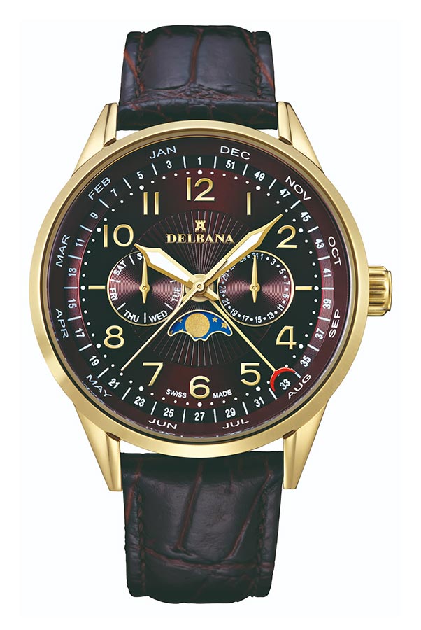 Pánské hodinky Delbana Retro Moonphase 42601.646.6.104 jsou modelem pro milovníky švýcarské kvality a doplňků v klasickém retro stylu. Pochází z kolekce klasických Retro hodinek inspirovaných ikonickými modely ze 40. a 50. let a fascinujícím způsobem spojuje minulost se současností. Delbana Retro Moonphase s obsáhlou, plnou kompaktně dostupných funkcí a složitě zdobeným ciferníkem vyrazí dech nejen znalcům hodinářství. Zabalené v lesklém a pozlaceném IPG (Ion Plating Gold) pouzdru z nerezové oceli a zavěšené na embosovaném mahagonově hnědém koženém řemínku je ideální nabídkou pro fanoušky originálních a nádherných hodinek.