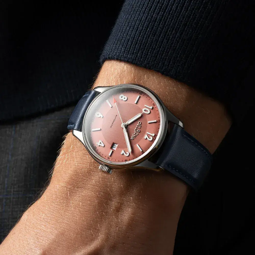 Pod tímto romantickým historickým vzhledem však bije zcela moderní a nekompromisní srdce v podobě švýcarského kalibru Sellita SW200-1. Tento mechanismus s automatickým nátahem, uložený na 26 kamenech, pracuje s frekvencí 28 800 polokmitů za hodinu, což se promítá do fascinující plynulosti pohybu sekundové ručky zakončené výraznou červenou špičkou. Klasické pánské hodinky na tmavě modrém koženém řemínku se světlým ciferníkem z kolekce Delbana Rotonda mají transparentní dýnko chráněné minerálním sklem, které umožňuje každodenní pozorování práce setrvačky a připomíná mistrovství tradiční mikromechaniky. Klasická rezerva chodu přibližně 41 hodin se skvěle hodí pro pravidelné každodenní nošení. V případě víkendové výměny hodinek a jejich ponechání v krabičce nás pondělní ráno přivítá nutností znovu nastavit čas, což pro mnoho milovníků mikromechaniky představuje přirozený, téměř očekávaný rituál kontaktu s tradičním kalibrem. Naopak vodotěsnost třídy 5 ATM (50 metrů) je optimalizována pro městský a kancelářský životní styl a spolehlivě chrání strojek před deštěm či postříkáním při mytí rukou.