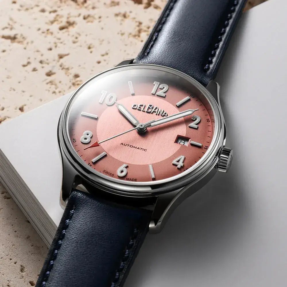 Švýcarské automatické pánské hodinky Delbana Rotonda 41603.722.6.182 představují fascinující cestu časem, která oslavuje 95leté dědictví značky a plnými doušky čerpá z ikonických návrhů poloviny 20. století. Monochromatický ciferník v barvě moka se zde stává plátnem pro historické inspirace, kde hlavní roli hraje fyzický kontrast textur. Vertikálně kartáčovaný střed ciferníku plynule přechází do surového, matného vnějšího prstence, což v kombinaci s aplikovanými arabskými číslicemi a luminiscenčními ručkami ve vintage stylu vytváří vícerozměrnou hloubku. Celý tento řemeslný hold završuje výrazně vypouklé safírové sklíčko, které svým specifickým profilem mistrovsky imituje akrylová sklíčka z minulosti, přičemž nabízí moderní, absolutní odolnost proti poškrábání.