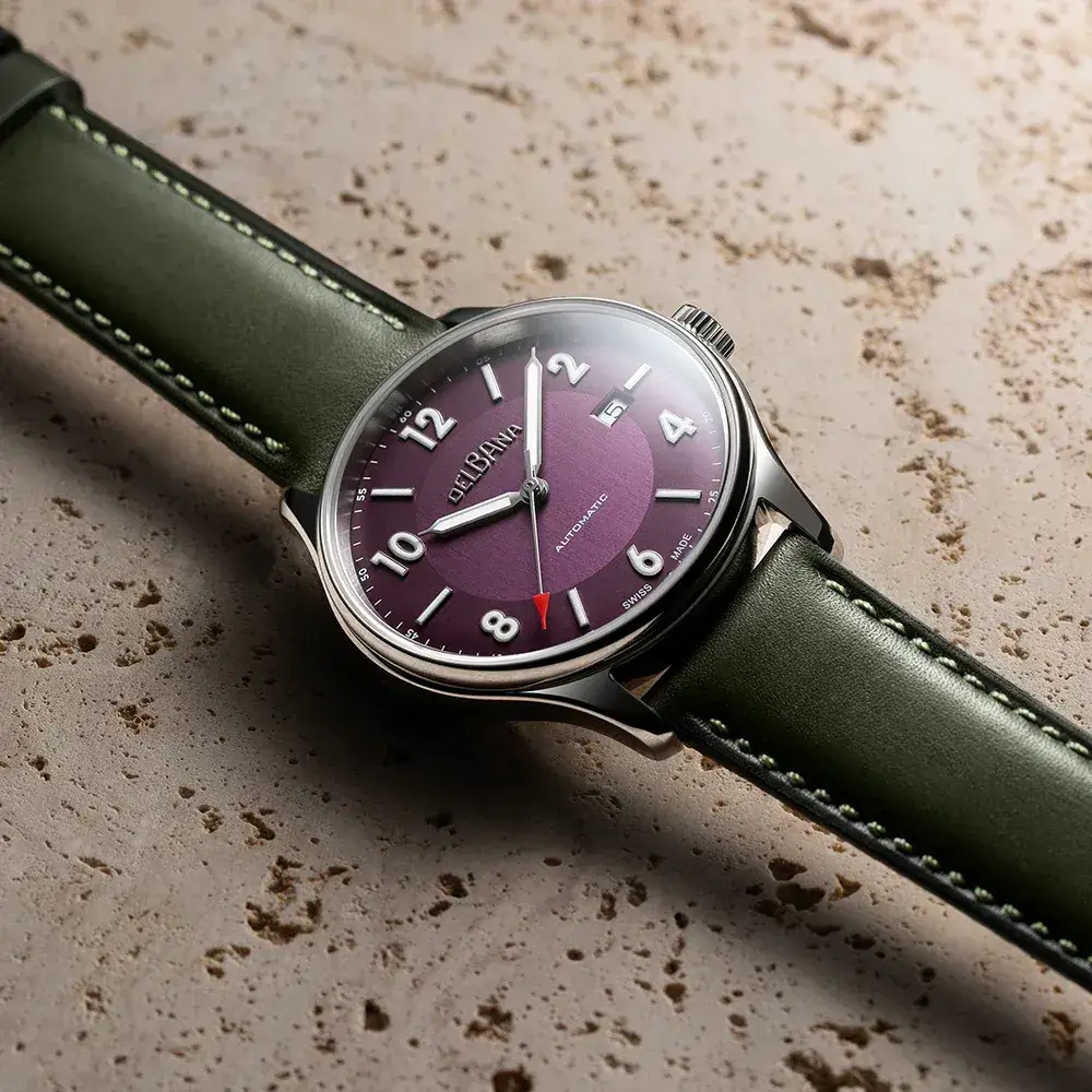 Pod tímto romantickým historickým vzhledem však bije zcela moderní a nekompromisní srdce v podobě švýcarského kalibru Sellita SW200-1. Tento mechanismus s automatickým nátahem, uložený na 26 kamenech, pracuje s frekvencí 28 800 polokmitů za hodinu, což se promítá do fascinující plynulosti pohybu sekundové ručky zakončené výraznou červenou špičkou. Klasické pánské hodinky na zeleném koženém řemínku s fialovým ciferníkem z kolekce Delbana Rotonda mají transparentní dýnko chráněné minerálním sklem, které umožňuje každodenní pozorování práce setrvačky a připomíná mistrovství tradiční mikromechaniky. Klasická rezerva chodu přibližně 41 hodin se skvěle hodí pro pravidelné každodenní nošení. V případě víkendové výměny hodinek a jejich ponechání v krabičce nás pondělní ráno přivítá nutností znovu nastavit čas, což pro mnoho milovníků mikromechaniky představuje přirozený, téměř očekávaný rituál kontaktu s tradičním kalibrem. Naopak vodotěsnost třídy 5 ATM (50 metrů) je optimalizována pro městský a kancelářský životní styl a spolehlivě chrání strojek před deštěm či postříkáním při mytí rukou.