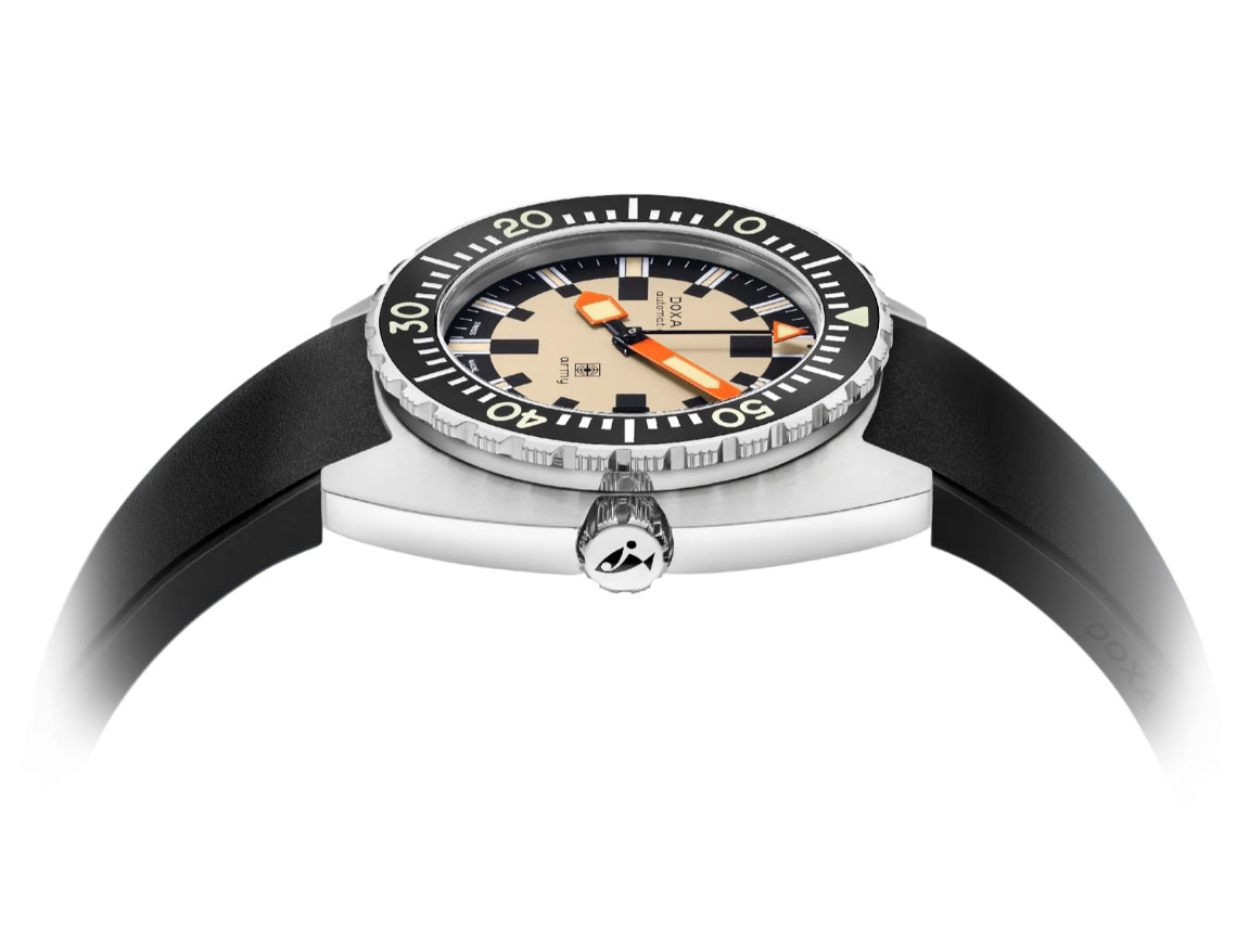 Nové armádní ocelové hodinky DOXA jsou umístěny v pouzdru o rozměrech 42,50 mm x 44,50 mm. Otočná luneta je vyrobena z černé keramiky. Ciferník je krytý safírovým sklíčkem, které je prakticky odolné proti poškrábání. Charakteristický vzhled charakterizuje barevná kombinace pískově béžové, černé, bílé a oranžové. Kromě originality vytváří efekt jedinečné kamufláže. Vnější minutová stupnice byla natřena bílou barvou. Hodinky obsahují výrazné oranžové ručky hodin a minut značky s materiálem Super-LumiNova®, který svítí ve tmě. Luminiscenční látka vytvořená Švýcary zaručuje absolutní čitelnost bez ohledu na hloubku. Profesionální diverské hodinky Doxa Army ve vojenském stylu jsou dodávány na kvalitním černém gumovém pásku FKM. Tento řemínek je vybaven motýlkovou sponou se 2 knoflíky s vyraženým exkluzivním vzorem Doxa Fish. Skládací spona je vybavena nastavitelným ráčnovým prodloužením zápěstí zesíleným diverským oblekem.
