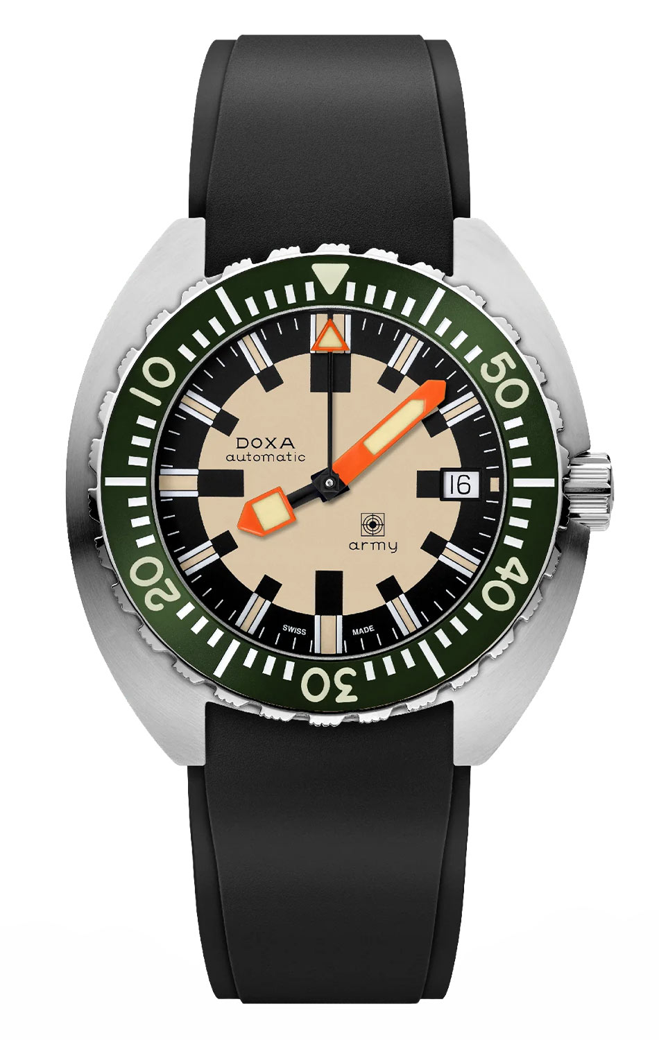 Pískově béžový ciferník s černým vnitřním kroužkem a kontrastními indexy odkazuje na vojenský původ tohoto modelu – čitelnost a funkčnost jsou zde na prvním místě. Silné oranžové ručky potažené Super-LumiNovou® zajišťují rychlý odečet času i v naprosté tmě, zatímco datumovka na třetí hodině dodává ciferníku praktičnost bez narušení vyváženého designu. Uvnitř pracuje automatický švýcarský strojek SW200-1 – přesný, spolehlivý a připravený k činnosti tak dlouho, jak dlouho se pohybuje jeho nositel. Rezerva chodu činí až 41 hodin. Automatické potápěčské hodinky Doxa Army 785.10.031G.20 na gumovém řemínku nejsou žádný retro doplněk – jsou moderní reedicí potápěčského nástroje s charakterem, vytvořeného pro ty, kteří od hodinek očekávají víc než jen dochvilnost.