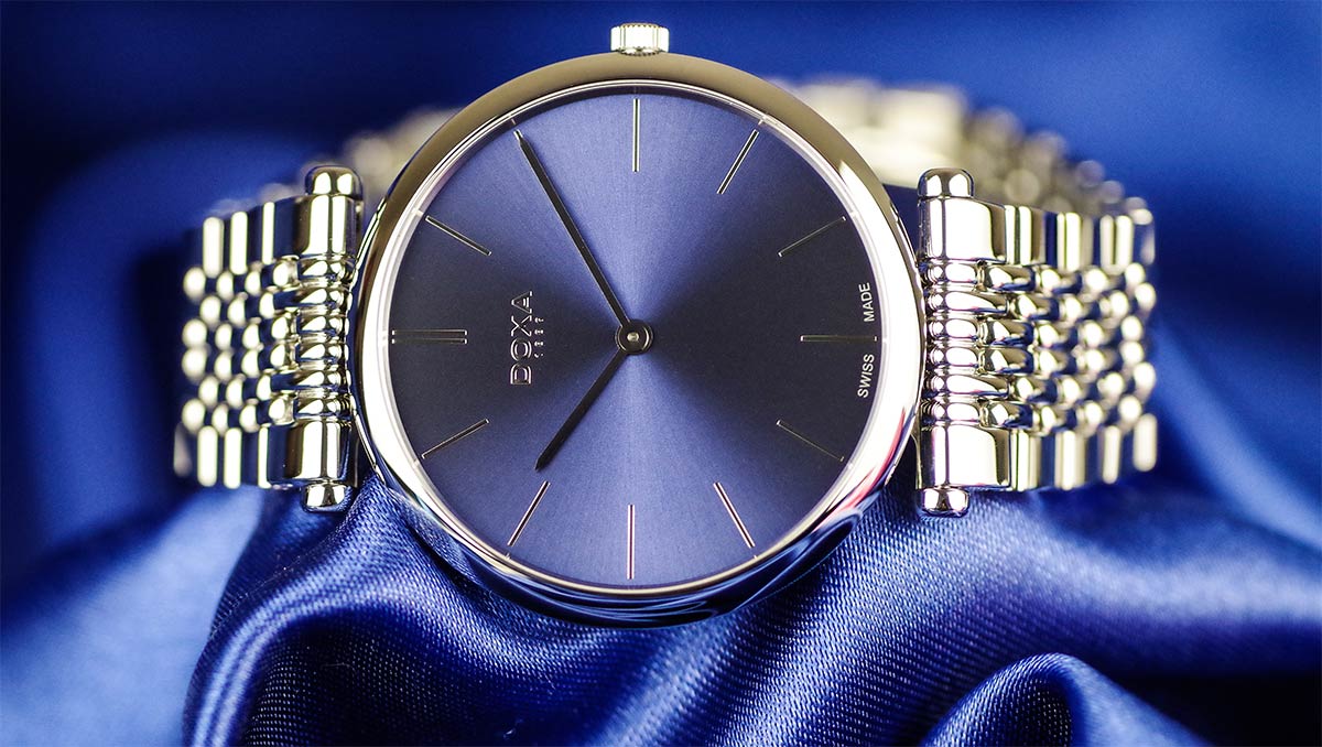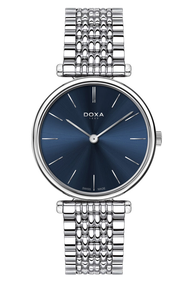 Švýcarské hodinky značky Doxa z pánské kolekce D-Lux . Kulaté pouzdro z nealergické nerezové oceli 316L ve stříbrné barvě, šířka 40 mm. Nerezová ocel 316L se vyznačuje vysokou odolností proti korozi. K pouzdru je připevněn ocelový náramek stříbrné barvy s bezpečnou motýlkovou sponou na 2 tlačítka. Pod tvrdým, těžko poškrábatelným safírovým sklíčkem najdeme modrý minimalistický ciferník s velkými lineárními indexy a logem značky Doxa. Srdcem hodinek je přesný Swiss Made quartz Machineek napájený baterií. Hodinky Doxa D-Lux s referenčním číslem 112.10.201.10 byly vyrobeny pro muže, který si cení minimalismus a klasický styl. Hodinky budou perfektní volbou ke každodennímu oblečení i ke klasické košili.