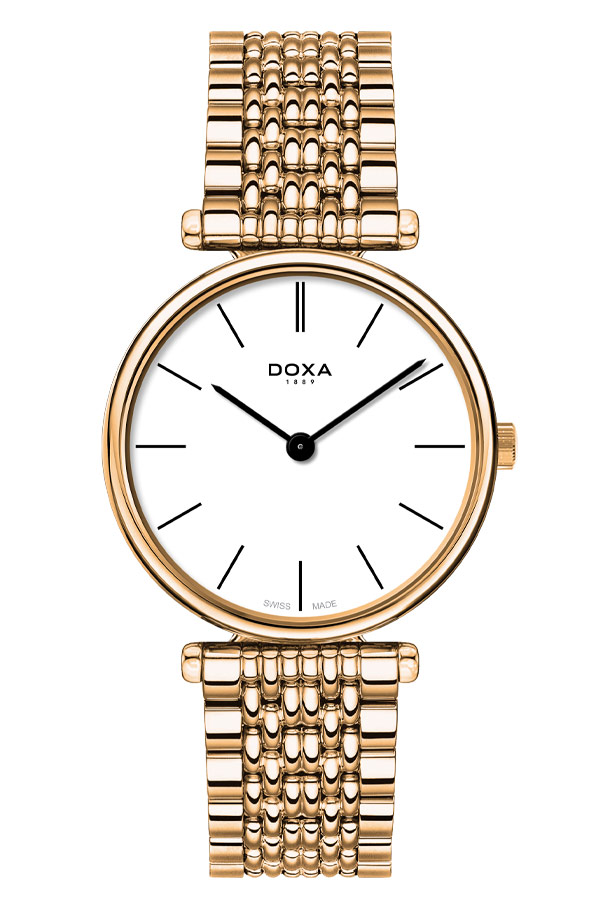 Švýcarské pozlacené hodinky Doxa z pánské kolekce D-Lux . Kulaté pouzdro z nealergenní nerezové oceli 316L v barvě růžového zlata PVD, šířka 40 mm. Nerezová ocel 316L se vyznačuje vysokou odolností proti korozi. K pouzdru je připevněn náramek z PVD oceli pozlacený růžovým zlatem s bezpečnou motýlkovou sponou na 2 tlačítka. Pod tvrdým, těžko poškrábatelným safírovým sklíčkem najdeme čistý minimalistický bílý ciferník s velkými lineárními indexy a logem značky Doxa. Srdcem hodinek je přesný Swiss Made quartz Machineek napájený baterií. Hodinky Doxa D-Lux s referenčním číslem 112.90.011.17 byly vyrobeny pro muže, který si cení minimalismus a klasický styl. Hodinky budou perfektní volbou ke každodennímu oblečení i ke klasické košili.