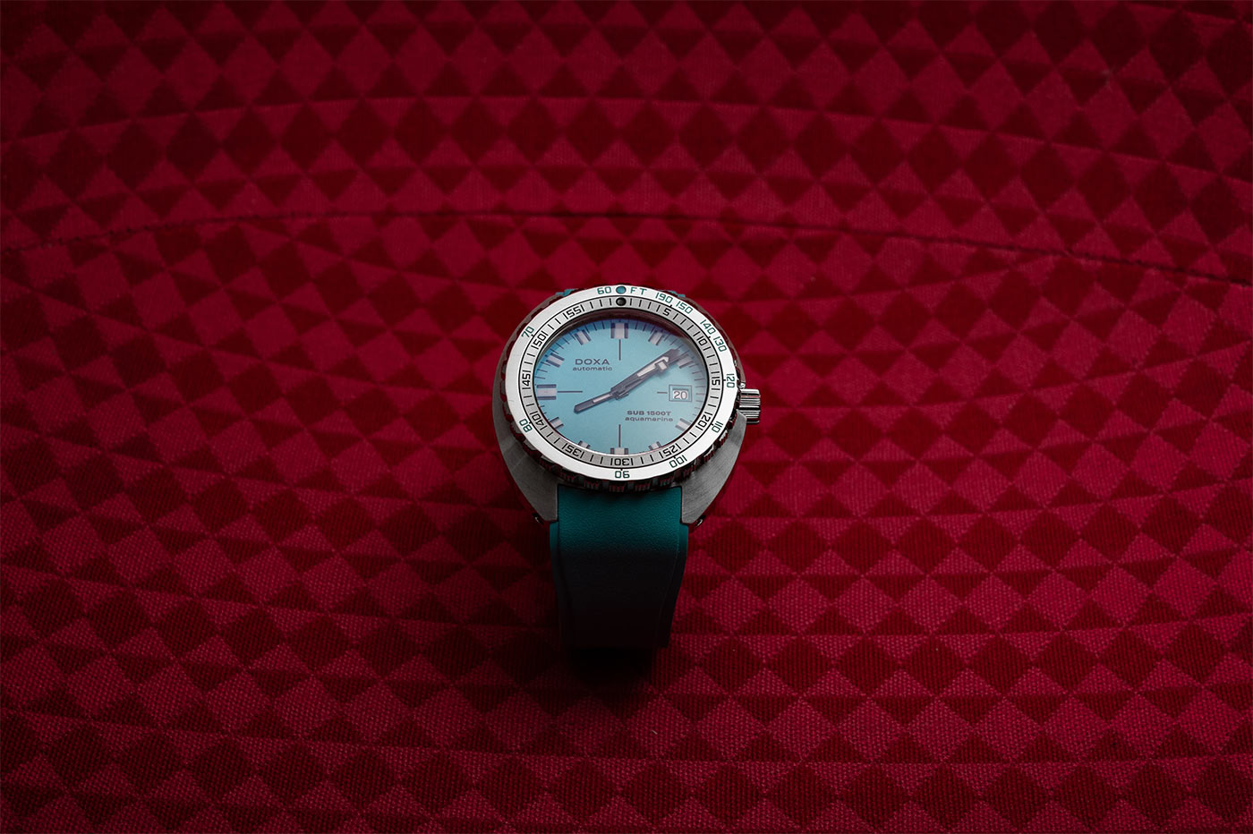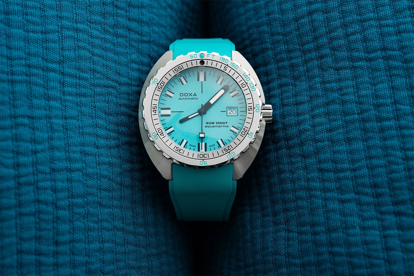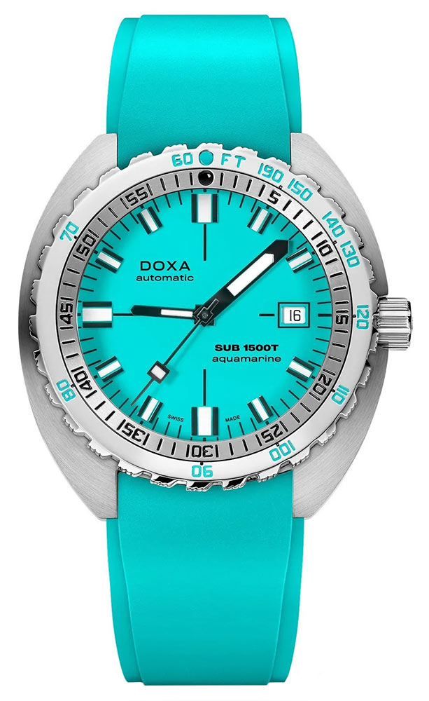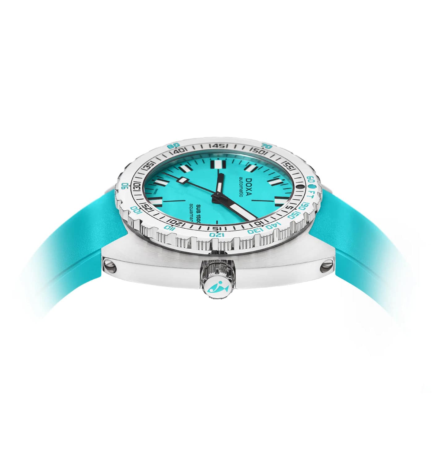 Nové diverské hodinky Doxa SUB 1500T Aquamarine jsou vybaveny 45mm odolným pouzdrem s integrovaným vypouštěcím ventilem helia – stejně jako jejich legendární předchůdce. A co víc, obsahuje patentovanou lunetu s dvojitým označením doby ponoru (minuty) a hloubky (stopy), vyvinutou pro řadu SUB v roce 1964. To vše pro výpočet bezpečného výstupu bez dekompresních zastávek.