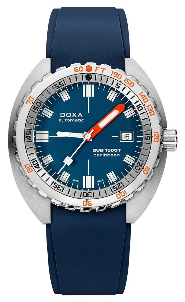 Nové diverské hodinky Doxa SUB 1500T Caribbean se vyznačují 45mm odolným pouzdrem s integrovaným vypouštěcím ventilem helia – stejně jako jejich legendární předchůdce. A co víc, obsahuje patentovanou lunetu s dvojitým označením doby ponoru (minuty) a hloubky (stopy), vyvinutou pro řadu SUB v roce 1964. To vše pro výpočet bezpečného výstupu bez dekompresních zastávek.
