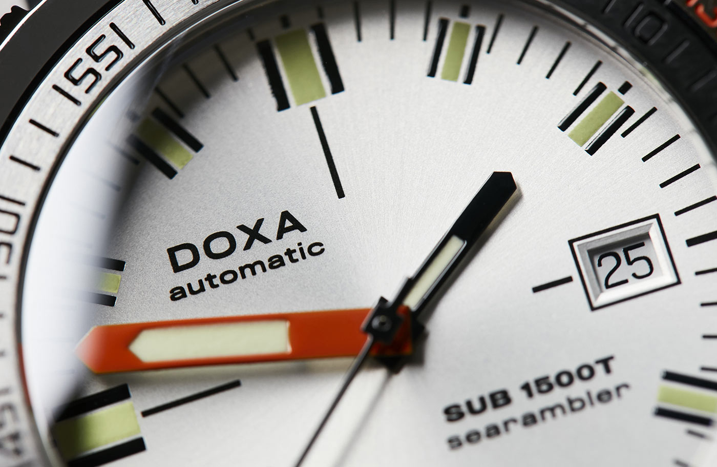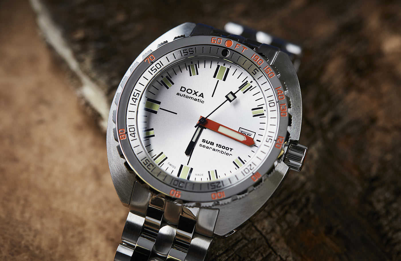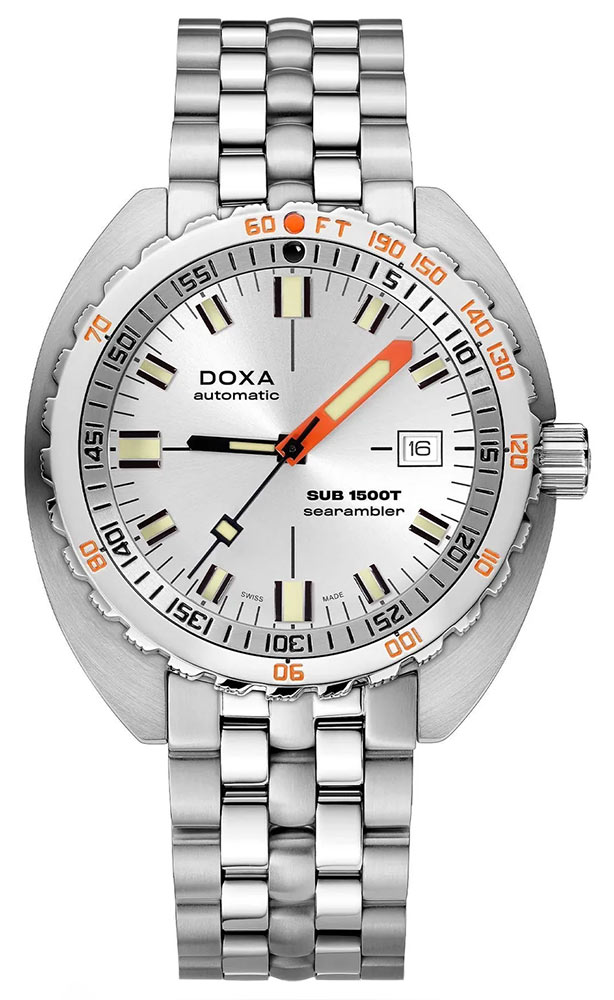 Nové diverské hodinky Doxa SUB 1500T Searambler se vyznačují 45mm odolným pouzdrem s integrovaným vypouštěcím ventilem helia – stejným jako jejich legendární předchůdce. A co víc, obsahuje patentovanou lunetu s dvojitým označením doby ponoru (minuty) a hloubky (stopy), vyvinutou pro řadu SUB v roce 1964. To vše pro výpočet bezpečného výstupu bez dekompresních zastávek.