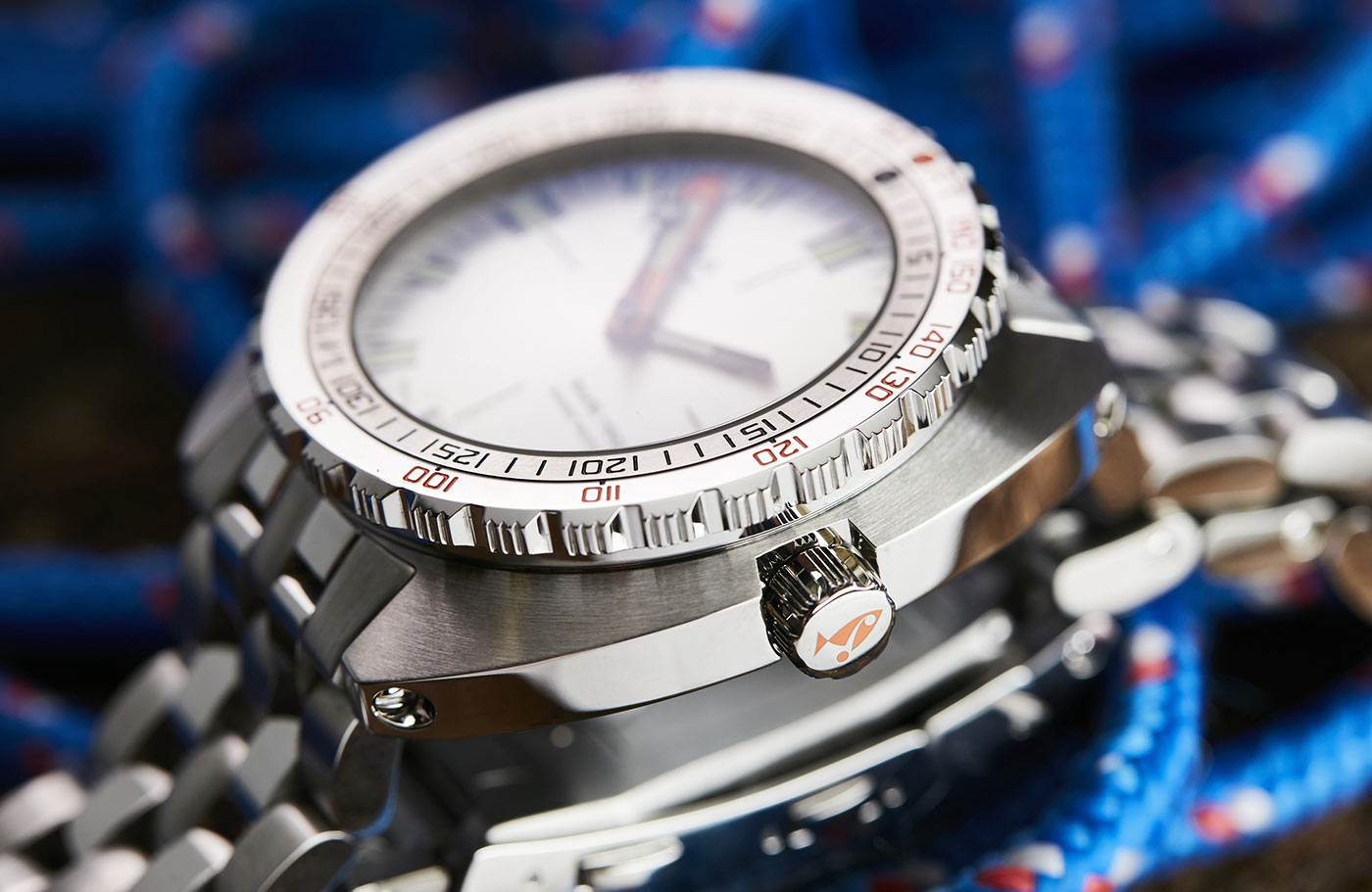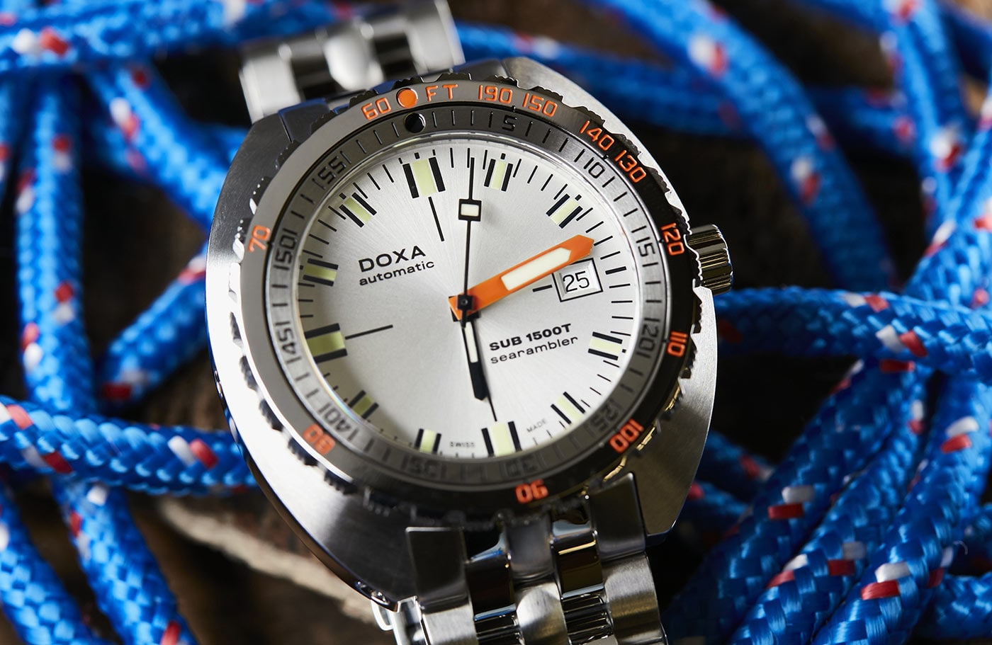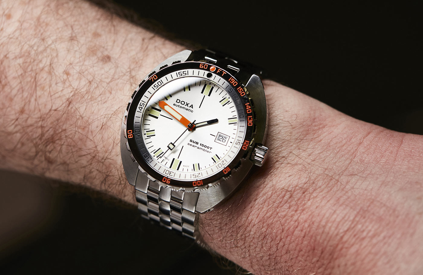 Nové diverské hodinky Doxa SUB 1500T Searambler se vyznačují 45mm odolným pouzdrem s integrovaným vypouštěcím ventilem helia – stejným jako jejich legendární předchůdce. A co víc, obsahuje patentovanou lunetu s dvojitým označením doby ponoru (minuty) a hloubky (stopy), vyvinutou pro řadu SUB v roce 1964. To vše pro výpočet bezpečného výstupu bez dekompresních zastávek.