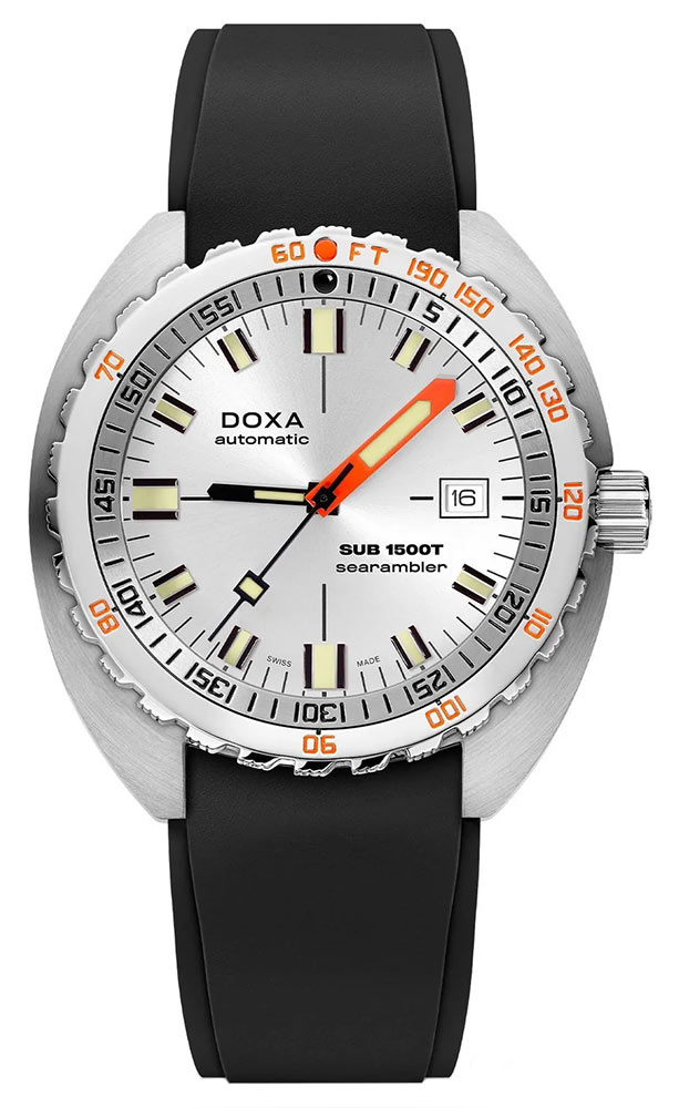 Nové diverské hodinky Doxa SUB 1500T Searambler se vyznačují 45mm odolným pouzdrem s integrovaným vypouštěcím ventilem helia – stejným jako jejich legendární předchůdce. A co víc, obsahuje patentovanou lunetu s dvojitým označením doby ponoru (minuty) a hloubky (stopy), vyvinutou pro řadu SUB v roce 1964. To vše pro výpočet bezpečného výstupu bez dekompresních zastávek.