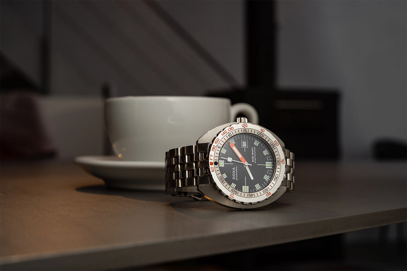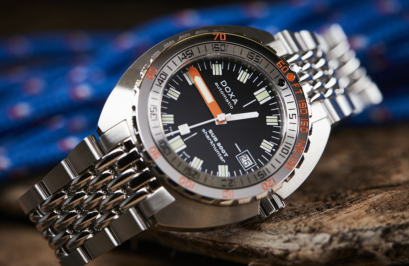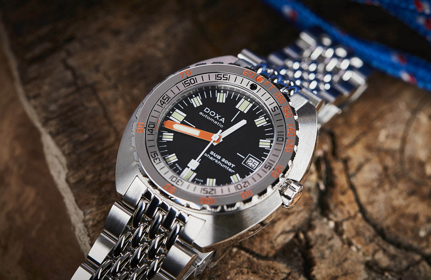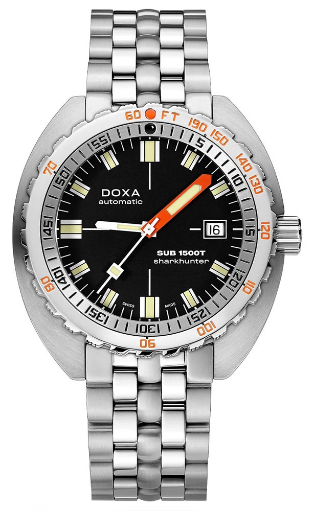 Nové diverské hodinky Doxa SUB 1500T Sharkhunter jsou vybaveny 45mm odolným pouzdrem s integrovaným vypouštěcím ventilem hélia – stejně jako jejich legendární předchůdce. A co víc, obsahuje patentovanou lunetu s dvojitým označením doby ponoru (minuty) a hloubky (stopy), vyvinutou pro řadu SUB v roce 1964. To vše pro výpočet bezpečného výstupu bez dekompresních zastávek.