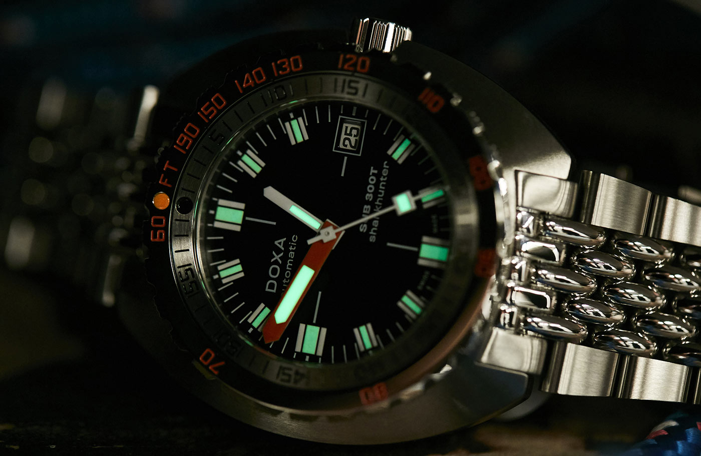 Všechny komponenty, které poskytují informace důležité pro diverskou misi, jsou vybaveny luminiscenční vrstvou Swiss Super-LumiNova® pro optimální čitelnost pod vodou. Střídavě 5řadý náramek z leštěné a broušené nerezové oceli je našroubovaný a má skládací sponu s prodloužením diverského obleku . Na sponě i šroubovací korunce je exkluzivní symbol ryby DOXA. Celek je poháněn švýcarským automatickým natahovacím Machinekem s rezervou chodu až 50 hodin .