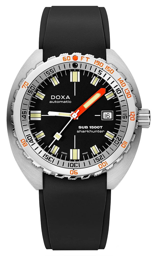 Nové diverské hodinky Doxa SUB 1500T Sharkhunter se vyznačují 45mm odolným pouzdrem s integrovaným vypouštěcím ventilem helia – stejně jako jejich legendární předchůdce. A co víc, obsahuje patentovanou lunetu s dvojitým označením doby ponoru (minuty) a hloubky (stopy), vyvinutou pro řadu SUB v roce 1964. To vše pro výpočet bezpečného výstupu bez dekompresních zastávek.