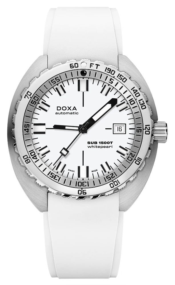 Nové diverské hodinky Doxa SUB 1500T Whitepearl se vyznačují 45mm odolným pouzdrem s integrovaným vypouštěcím ventilem helia – stejně jako jejich legendární předchůdce. A co víc, obsahuje patentovanou lunetu s dvojitým označením doby ponoru (minuty) a hloubky (stopy), vyvinutou pro řadu SUB v roce 1964. To vše pro výpočet bezpečného výstupu bez dekompresních zastávek.