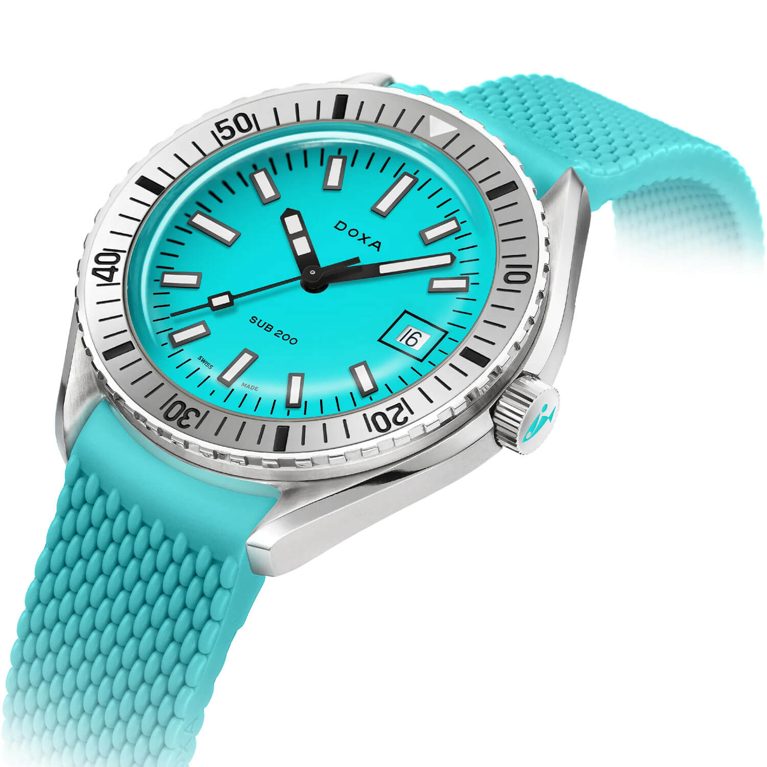 Modrý číselník zde nebyl použit náhodou – tato barva zajišťuje vysoký kontrast pod vodou. Díky použití indexů a ručiček pokrytých vrstvou Super-LumiNova® zůstávají hodinky čitelné i v naprosté tmě. Na pozici třetí hodiny je umístěno decentní datumové okénko v rámečku, které harmonicky doplňuje kompozici ciferníku. Tyto hodinky nebyly stvořeny proto, aby přitahovaly pohledy ve vitrínách – potápěčské hodinky Doxa SUB 200 Automatic 796.10.241.25 na gumovém řemínku jsou nástroj určený k akci, ne k pózování.
