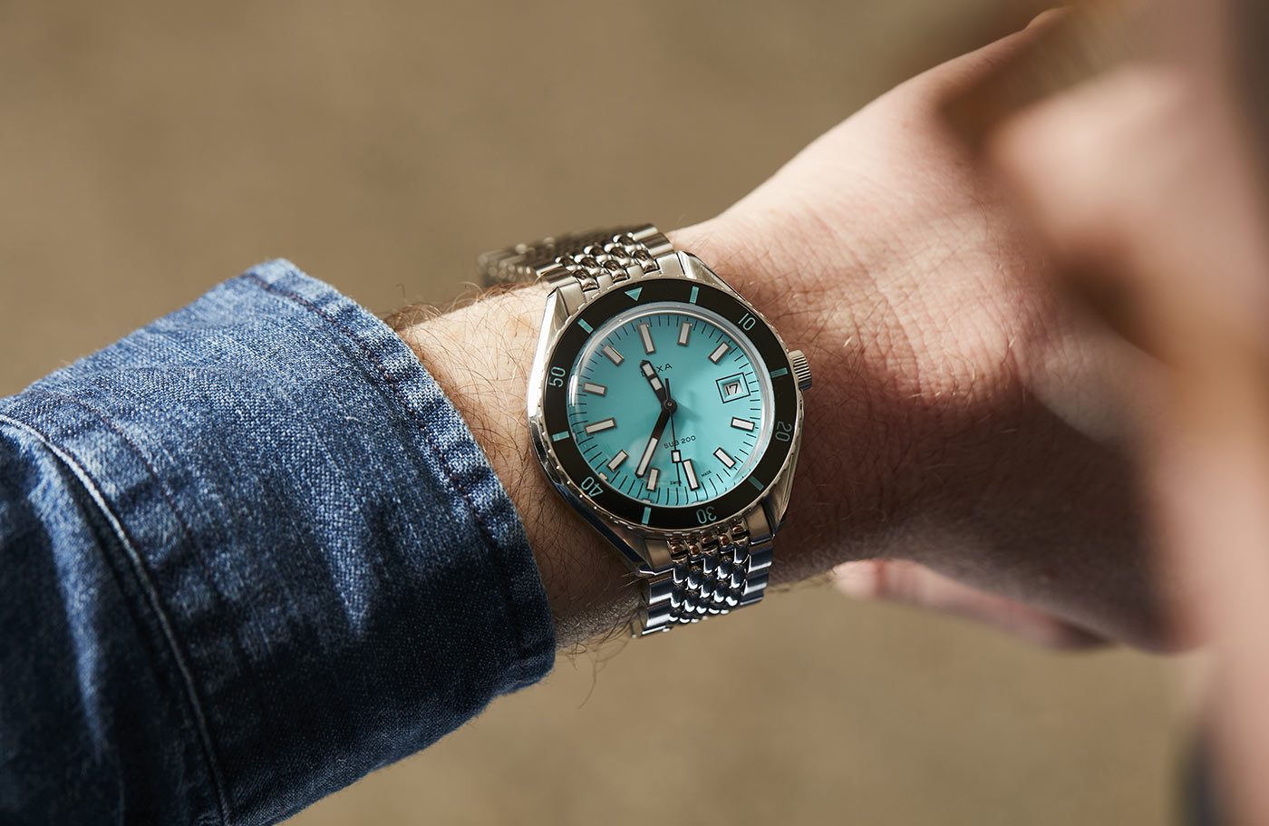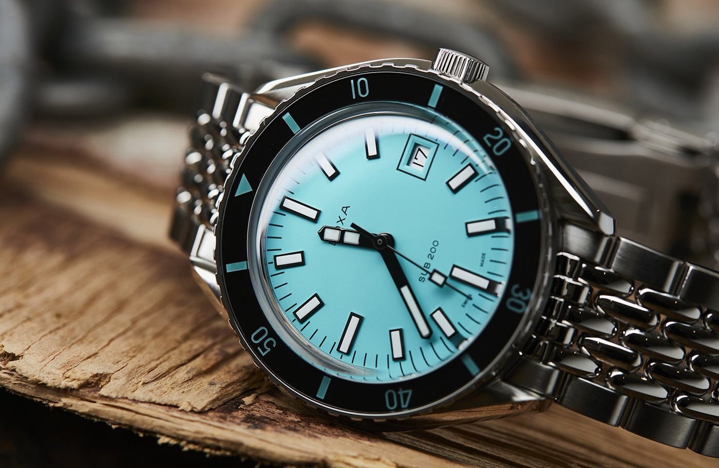 Celá Doxa Aquamarine je zavěšena na stříbrném náramku s designem „samostatných rýžových korálků“, které drží pohromadě šrouby pro bezpečné uchycení. Na zápěstí se zapíná pevnou překlápěcí sponou s exkluzivním symbolem ryby (ryba DOXA). Náramek diverských hodinek DOXA SUB 200 má navíc nástavec, díky kterému lze časomíru úspěšně připnout na zápěstí v diverském obleku. Je poháněn švýcarským mechanickým samonatahovacím Machinekem s rezervou chodu 38 hodin , 26 drahokamy a frekvencí 28 800 vph (4,0 Hz).