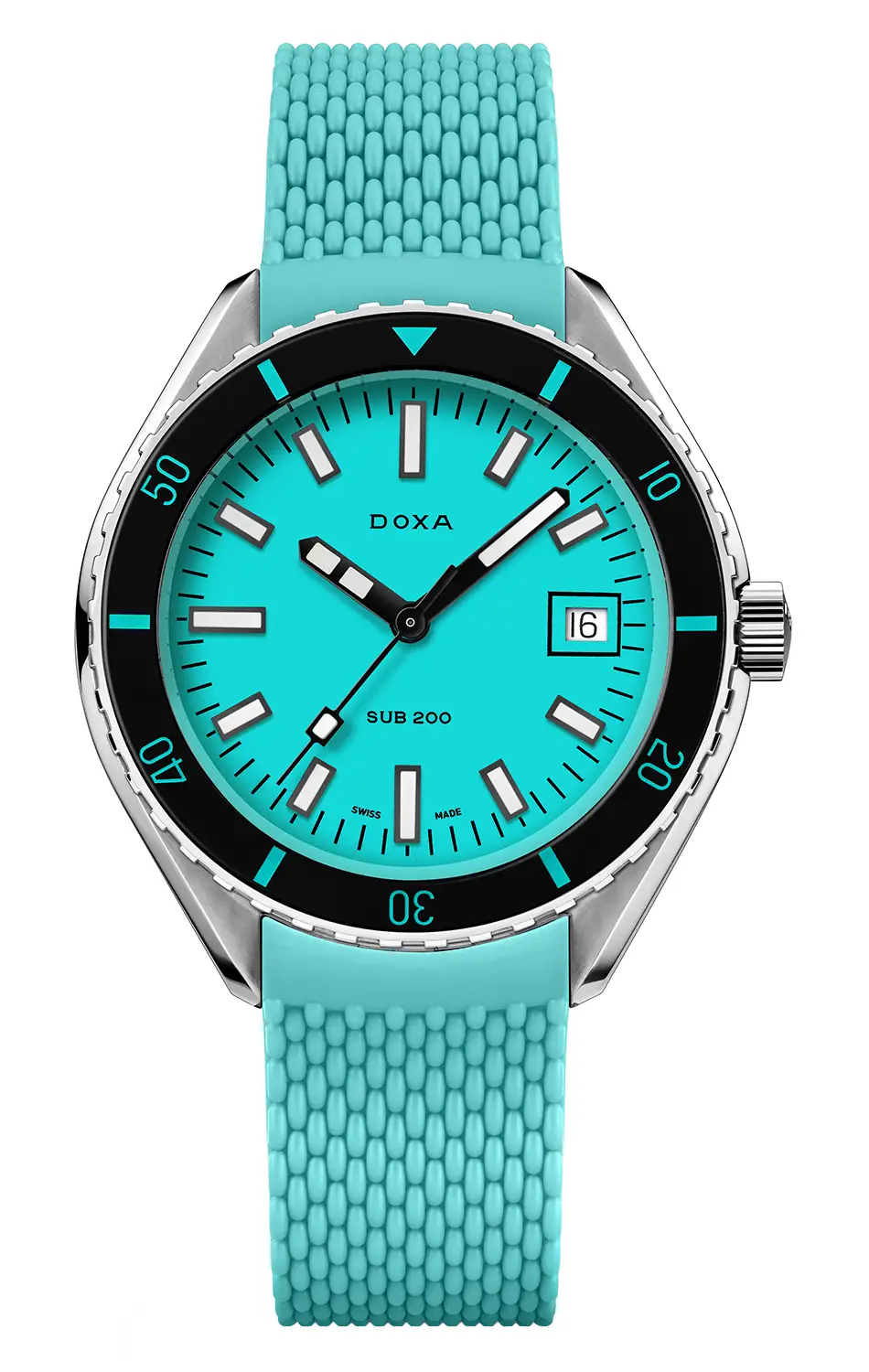 Výše uvedené pánské diverské hodinky Doxa SUB 200 Aquamarine s referenčním číslem 799.10.241.25 mají jednosměrně otočnou lunetu se stupnicí 60 minut, funkční akvamarínový ciferník a dobře čitelné indexy a ručičky. Všechny datové prvky důležité pro potápění, včetně lunety, jsou vyplněny luminiscenční vrstvou Super-LumiNova®.