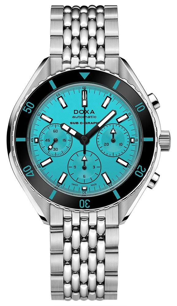 DOXA SUB 200 C-GRAPH Aquamarine jsou profesionální diverské hodinky s tyrkysovým ciferníkem a pevným pouzdrem z nerezové oceli s konstrukcí „samostatných rýžových korálků“, které drží pohromadě šrouby pro bezpečné uchycení. SUB 200 C-GRAPH je chronograficky vylepšená verze tříručičkových automatických diverských hodinek řady SUB 200. Obě kolekce se vyznačují vysoce odolným proti poškrábání a antireflexním klenutým safírovým sklem.