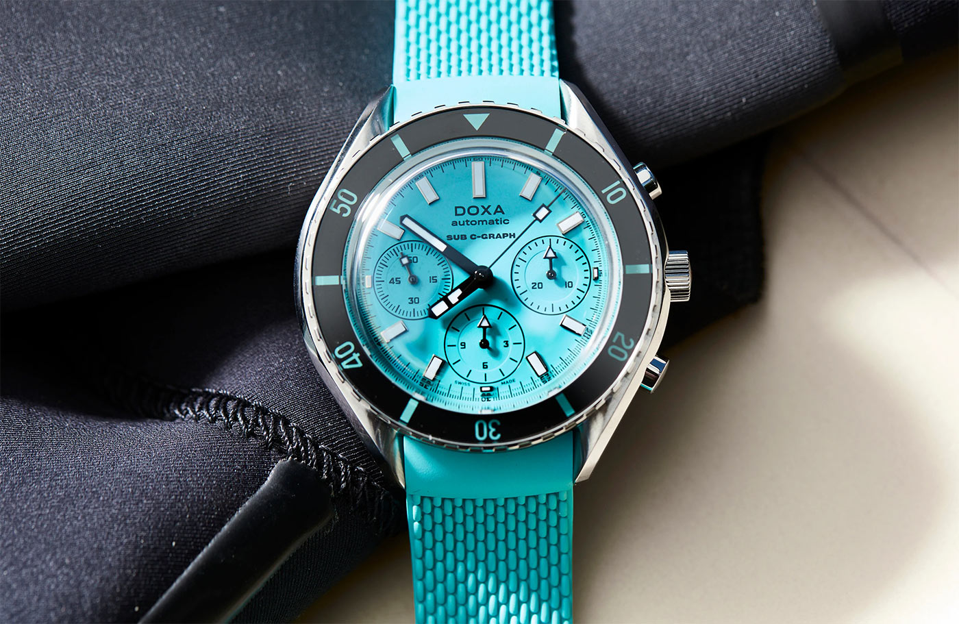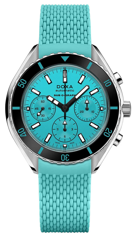 DOXA SUB 200 C-GRAPH Aquamarine jsou profesionální diverské hodinky s tyrkysovým ciferníkem, pevným pouzdrem z nerezové oceli 316L a extrémně odolným řemínkem z kvalitní FKM pryže. SUB 200 C-GRAPH je chronograficky vylepšená verze tříručičkových automatických diverských hodinek řady SUB 200. Obě kolekce se vyznačují vysoce odolným proti poškrábání a antireflexním klenutým safírovým sklem.