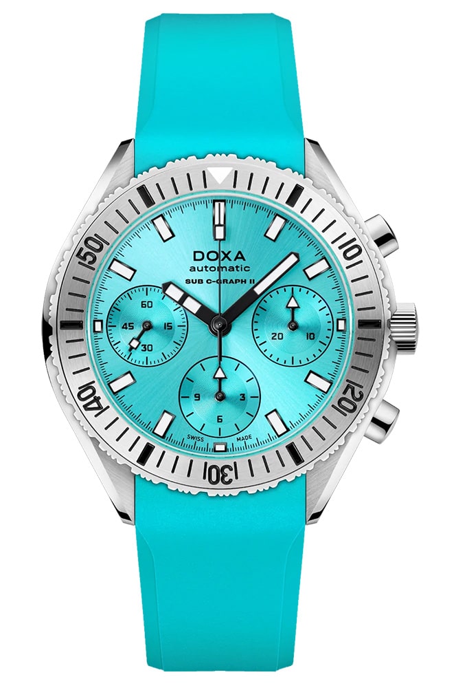 Pánské diverské hodinky Doxa SUB 200 C-Graph II, vodotěsné do 200 metrů. Poháněno vysoce přesným švýcarským automatickým samonatahovacím Machinekem s komplikovaným chronografem (28 800 vph, 4,0 Hz, 27 drahokamů, 56 hodin rezervy chodu). Umístěn v menším, modernějším - oproti předchůdci - pouzdru o průměru 42 mm a tloušťce 15,85 mm. Je vyrobena z antialergické a odolné nerezové oceli 316L. Výše uvedená varianta Doxa SUB 200 C-Graph II Aquamarine 797.10.241.25 se vyznačuje neonově tyrkysovými barvami a ocelovou lunetou otočnou v jednom směru.