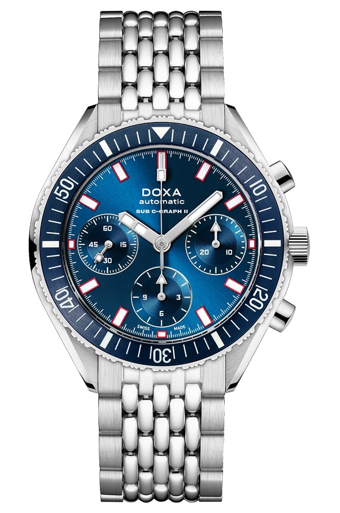 Pánské diverské hodinky Doxa SUB 200 C-Graph II, vodotěsné do 200 metrů. Poháněno vysoce přesným švýcarským automatickým samonatahovacím Machinekem s komplikovaným chronografem (28 800 vph, 4,0 Hz, 27 drahokamů, 56 hodin rezervy chodu). Umístěn v menším, modernějším - oproti předchůdci - pouzdru o průměru 42 mm a tloušťce 15,85 mm. Pouzdro i ikonický náramek "rýžové korálky" jsou vyrobeny z antialergické a odolné nerezové oceli 316L. Výše uvedená varianta Doxa SUB 200 C-Graph II Caribbean 797.10.201.10 se vyznačuje tmavě modrým číselníkem a jednosměrnou keramickou lunetou .