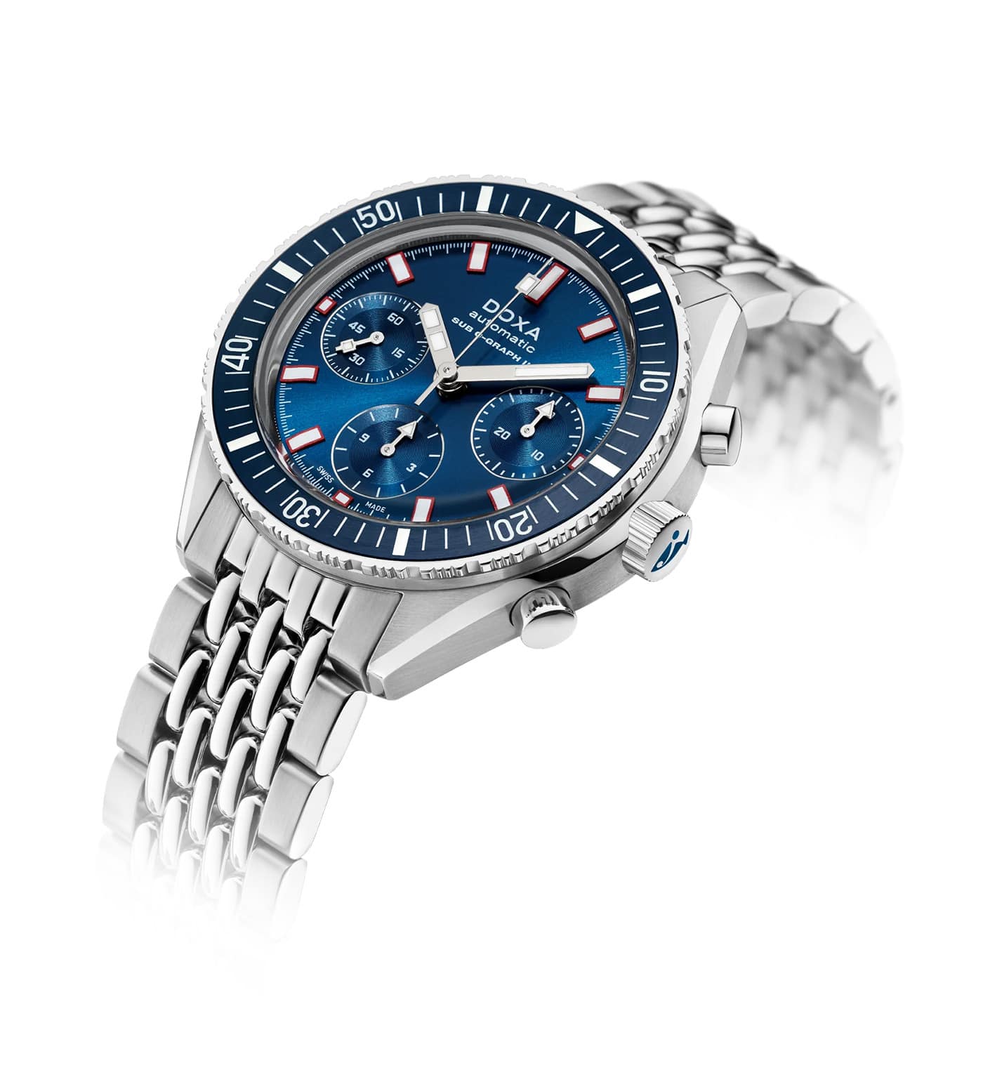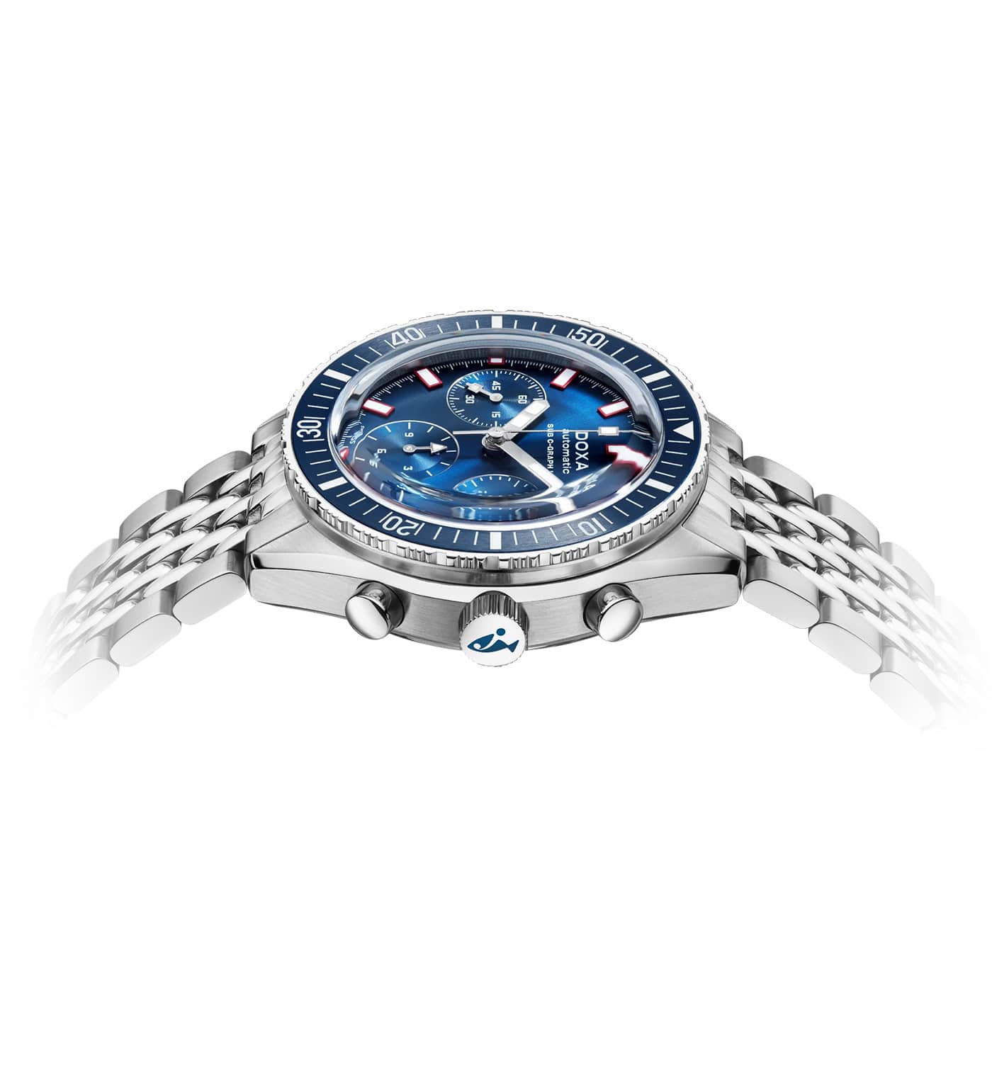 Ciferník profesionálních diverských hodinek Doxa SUB 200 C-Graph II oslní novým svítivým povrchem, který vyjadřuje vintage ducha kolekce. Světelný efekt sluneční erupce dodává disku jemnou, zvláštní eleganci. Ochrannou funkci nad ním plní safírové sklíčko prakticky odolné proti poškrábání s antireflexní vrstvou, která umožňuje jasně odečítat čas z jakéhokoli úhlu. S ocelovým náramkem se skládací sponou s diverským nástavcem a nižší hmotností jsou tyto diverské hodinky Doxa SUB perfektní pro divere, kteří hledají spolehlivý a vysoce výkonný náMachine.