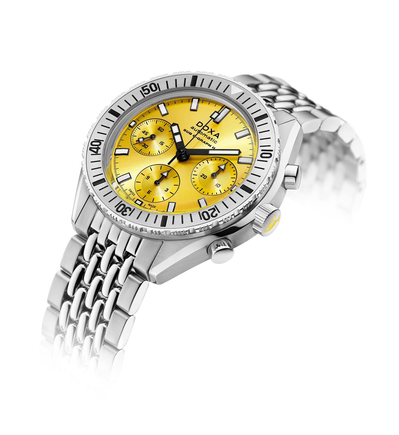 Pánské diverské hodinky Doxa SUB 200 C-Graph II, vodotěsné do 200 metrů. Poháněno vysoce přesným švýcarským automatickým samonatahovacím Machinekem s komplikovaným chronografem (28 800 vph, 4,0 Hz, 27 drahokamů, 56 hodin rezervy chodu). Umístěn v menším, modernějším - oproti předchůdci - pouzdru o průměru 42 mm a tloušťce 15,85 mm. Pouzdro i ikonický náramek "rýžové korálky" jsou vyrobeny z antialergické a odolné nerezové oceli 316L. Výše uvedená varianta Doxa SUB 200 C-Graph II Divingstar 797.10.361.10 se vyznačuje žlutou barvou ciferníku a ocelovou lunetou otočnou v jednom směru.