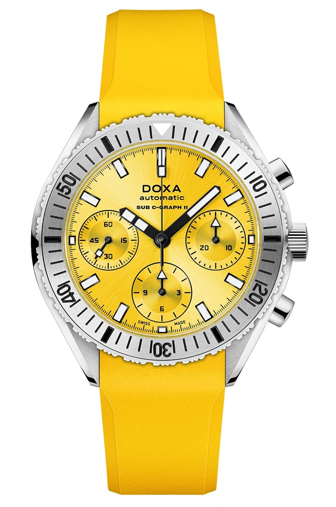 Druhý díl kolekce Doxa SUB 200 C-Graph II nabízí model Tri-Compax se třemi diverskými časovači a jednosměrně otočnou lunetou s bílou vrstvou Super-Luminova™ na minutovém displeji. Tato kolekce je navržena tak, aby nabídla náMachineové hodinky pro vysoce rizikové divere a zároveň kultivovala sportovní eleganci v městském prostředí. S modernějším průměrem, tlakovou odolností až 20 ATM a 56hodinovou rezervou chodu sdílejí hodinky Doxa SUB 200 C-Graph II s chronografem stejné vlastnosti a funkce jako jejich větší 45,00 mm sourozenec představený v roce 2020.