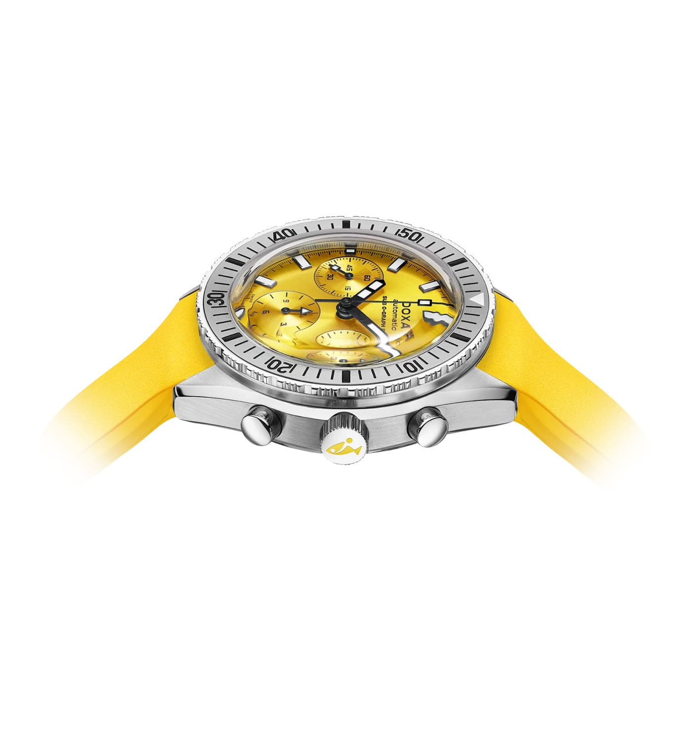 Ciferník profesionálních diverských hodinek Doxa SUB 200 C-Graph II oslní novým svítivým povrchem, který vyjadřuje vintage ducha kolekce. Světelný efekt sluneční erupce dodává disku jemnou, zvláštní eleganci. Ochrannou funkci nad ním plní safírové sklíčko prakticky odolné proti poškrábání s antireflexní vrstvou, která umožňuje jasně odečítat čas z jakéhokoli úhlu. Řemínek z FKM pryže s exkluzivním symbolem Doxa Fish na přezce je voděodolný a snadno se udržuje. V kombinaci s nižší hmotností jsou tyto diverské hodinky Doxa SUB ideální pro divere, kteří hledají spolehlivý a vysoce výkonný náMachine.