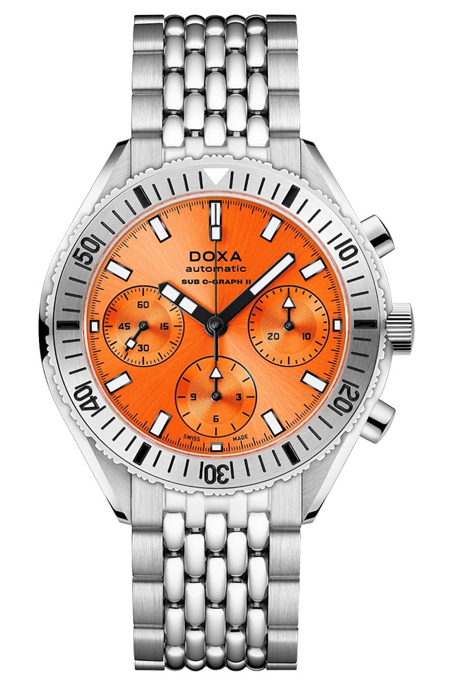 Pánské diverské hodinky Doxa SUB 200 C-Graph II, vodotěsné do 200 metrů. Poháněno vysoce přesným švýcarským automatickým samonatahovacím Machinekem s komplikovaným chronografem (28 800 vph, 4,0 Hz, 27 drahokamů, 56 hodin rezervy chodu). Umístěn v menším, modernějším - oproti předchůdci - pouzdru o průměru 42 mm a tloušťce 15,85 mm. Pouzdro i ikonický náramek "rýžové korálky" jsou vyrobeny z antialergické a odolné nerezové oceli 316L. Výše uvedená varianta Doxa SUB 200 C-Graph II Professional 797.10.351.10 se vyznačuje oranžovou barvou ciferníku a ocelovou lunetou otočnou v jednom směru.