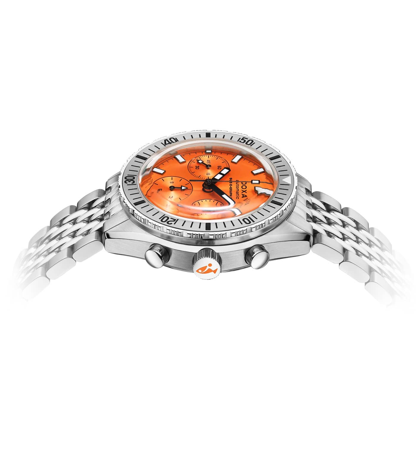 Ciferník profesionálních diverských hodinek Doxa SUB 200 C-Graph II oslní novým svítivým povrchem, který vyjadřuje vintage ducha kolekce. Světelný efekt sluneční erupce dodává disku jemnou, zvláštní eleganci. Ochrannou funkci nad ním plní safírové sklíčko prakticky odolné proti poškrábání s antireflexní vrstvou, která umožňuje zřetelně odečítat čas z jakéhokoli úhlu. S ocelovým náramkem se skládací sponou s diverským nástavcem a nižší hmotností jsou tyto diverské hodinky Doxa SUB perfektní pro divere, kteří hledají spolehlivý a vysoce výkonný náMachine.