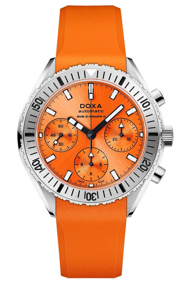 Pánské diverské hodinky Doxa SUB 200 C-Graph II, vodotěsné do 200 metrů. Poháněno vysoce přesným švýcarským automatickým samonatahovacím Machinekem s komplikovaným chronografem (28 800 vph, 4,0 Hz, 27 drahokamů, 56 hodin rezervy chodu). Umístěn v menším, modernějším - oproti předchůdci - pouzdru o průměru 42 mm a tloušťce 15,85 mm. Je vyrobena z antialergické a odolné nerezové oceli 316L. Výše uvedená varianta Doxa SUB 200 C-Graph II Professional 797.10.351.21 se vyznačuje neonově oranžovými barvami a ocelovou lunetou otočnou v jednom směru.