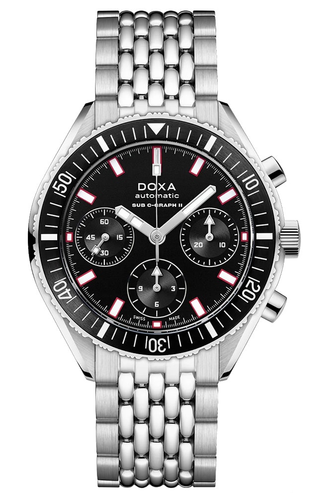 Pánské diverské hodinky Doxa SUB 200 C-Graph II, vodotěsné do 200 metrů. Poháněno vysoce přesným švýcarským automatickým samonatahovacím Machinekem s komplikovaným chronografem (28 800 vph, 4,0 Hz, 27 drahokamů, 56 hodin rezervy chodu). Umístěn v menším, modernějším - oproti předchůdci - pouzdru o průměru 42 mm a tloušťce 15,85 mm. Pouzdro i ikonický náramek "rýžové korálky" jsou vyrobeny z antialergické a odolné nerezové oceli 316L. Výše uvedená varianta Doxa SUB 200 C-Graph II Sharkhunter 797.10.101.10 se vyznačuje černou barvou ciferníku a keramickou lunetou otočnou v jednom směru.