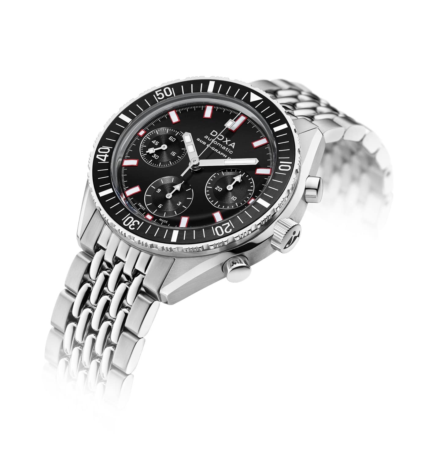 Ciferník profesionálních diverských hodinek Doxa SUB 200 C-Graph II oslní novým svítivým povrchem, který vyjadřuje vintage ducha kolekce. Světelný efekt sluneční erupce dodává disku jemnou, zvláštní eleganci. Ochrannou funkci nad ním plní safírové sklíčko prakticky odolné proti poškrábání s antireflexní vrstvou, která umožňuje zřetelně odečítat čas z jakéhokoli úhlu. S ocelovým náramkem se skládací sponou s diverským nástavcem a nižší hmotností jsou tyto diverské hodinky Doxa SUB perfektní pro divere, kteří hledají spolehlivý a vysoce výkonný náMachine.