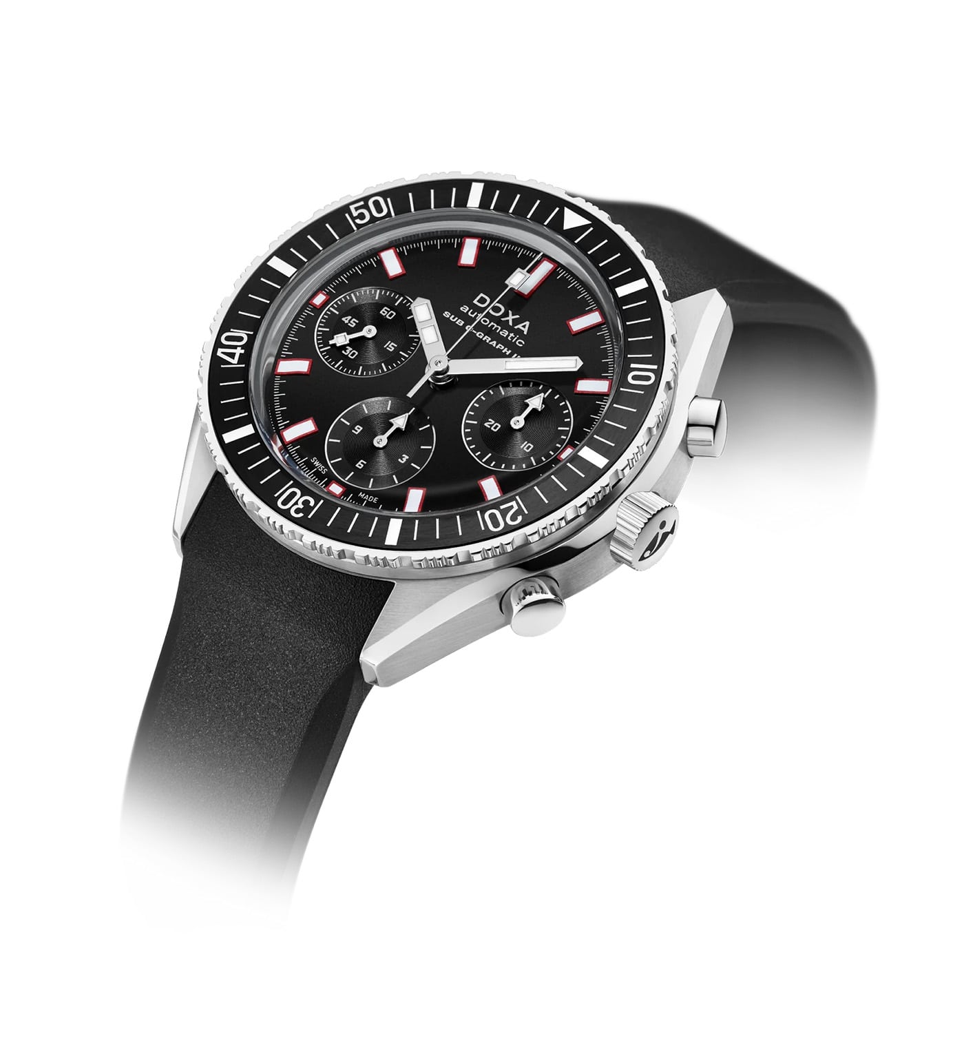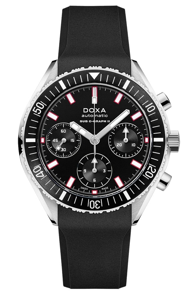 Druhý díl kolekce Doxa SUB 200 C-Graph II nabízí model Tri-Compax se třemi diverskými časovači a jednosměrně otočnou lunetou s bílou vrstvou Super-Luminova™ na minutovém displeji. Tato kolekce je navržena tak, aby nabídla náMachineové hodinky pro vysoce rizikové divere a zároveň kultivovala sportovní eleganci v městském prostředí. S modernějším průměrem, tlakovou odolností až 20 ATM a 56hodinovou rezervou chodu sdílejí hodinky Doxa SUB 200 C-Graph II s chronografem stejné vlastnosti a funkce jako jejich větší 45,00 mm sourozenec představený v roce 2020.
