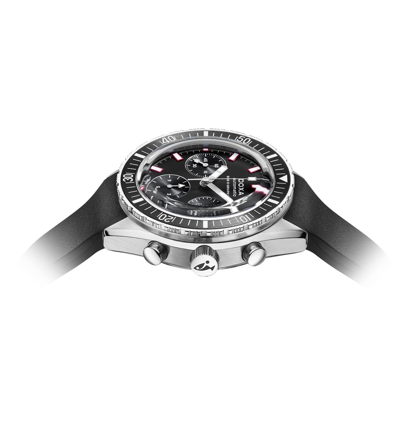 Ciferník profesionálních diverských hodinek Doxa SUB 200 C-Graph II oslní novým svítivým povrchem, který vyjadřuje vintage ducha kolekce. Světelný efekt sluneční erupce dodává disku jemnou, zvláštní eleganci. Ochrannou funkci nad ním plní safírové sklíčko prakticky odolné proti poškrábání s antireflexní vrstvou, která umožňuje zřetelně odečítat čas z jakéhokoli úhlu. Řemínek z FKM pryže s exkluzivním symbolem Doxa Fish na přezce je voděodolný a snadno se udržuje. V kombinaci s nižší hmotností jsou tyto diverské hodinky Doxa SUB ideální pro divere, kteří hledají spolehlivý a vysoce výkonný náMachine.
