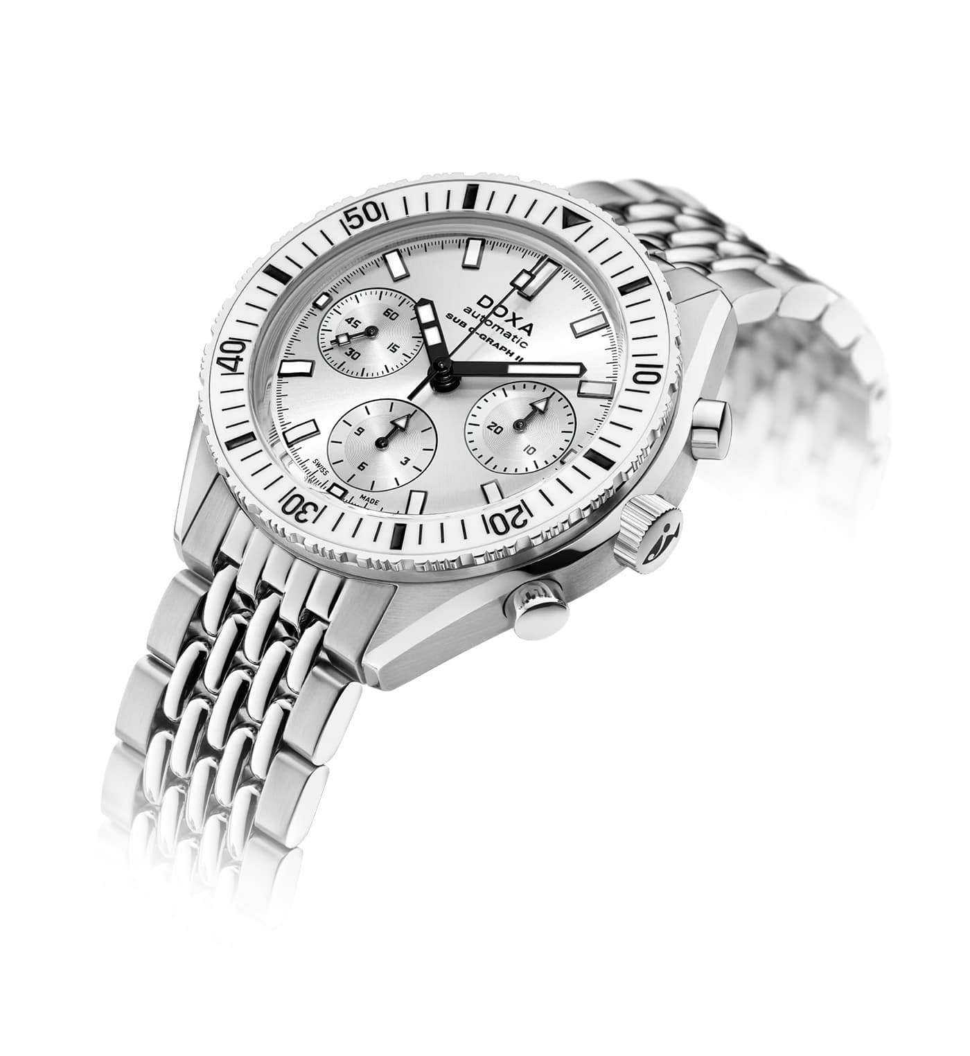Pánské diverské hodinky Doxa SUB 200 C-Graph II, vodotěsné do 200 metrů. Poháněno vysoce přesným švýcarským automatickým samonatahovacím Machinekem s komplikovaným chronografem (28 800 vph, 4,0 Hz, 27 drahokamů, 56 hodin rezervy chodu). Umístěn v menším, modernějším - oproti předchůdci - pouzdru o průměru 42 mm a tloušťce 15,85 mm. Pouzdro i ikonický náramek "rýžové korálky" jsou vyrobeny z antialergické a odolné nerezové oceli 316L. Výše uvedená varianta Doxa SUB 200 C-Graph II Whitepearl 797.10.011W.10 se vyznačuje monochromatickými barvami a keramickou lunetou otočnou v jednom směru.