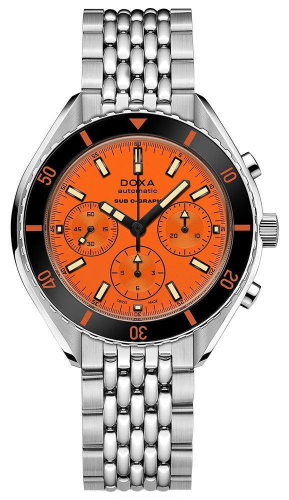 DOXA SUB 200 C-GRAPH Professional jsou profesionální diverské hodinky s oranžovým ciferníkem a pevným pouzdrem z nerezové oceli s konstrukcí „samostatných rýžových korálků“, které drží pohromadě šrouby pro bezpečné uchycení. SUB 200 C-GRAPH je chronograficky vylepšená verze tříručičkových automatických diverských hodinek řady SUB 200. Obě kolekce se vyznačují vysoce odolným proti poškrábání a antireflexním klenutým safírovým sklem.