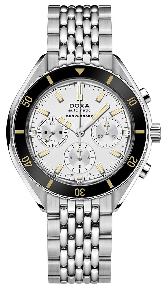 DOXA SUB 200 C-GRAPH Searambler jsou profesionální diverské hodinky se stříbrným ciferníkem a pevným pouzdrem z nerezové oceli s konstrukcí „samostatných rýžových korálků“, které drží pohromadě šrouby pro bezpečné uchycení. SUB 200 C-GRAPH je chronograficky vylepšená verze tříručičkových automatických diverských hodinek řady SUB 200. Obě kolekce se vyznačují vysoce odolným proti poškrábání a antireflexním klenutým safírovým sklem.