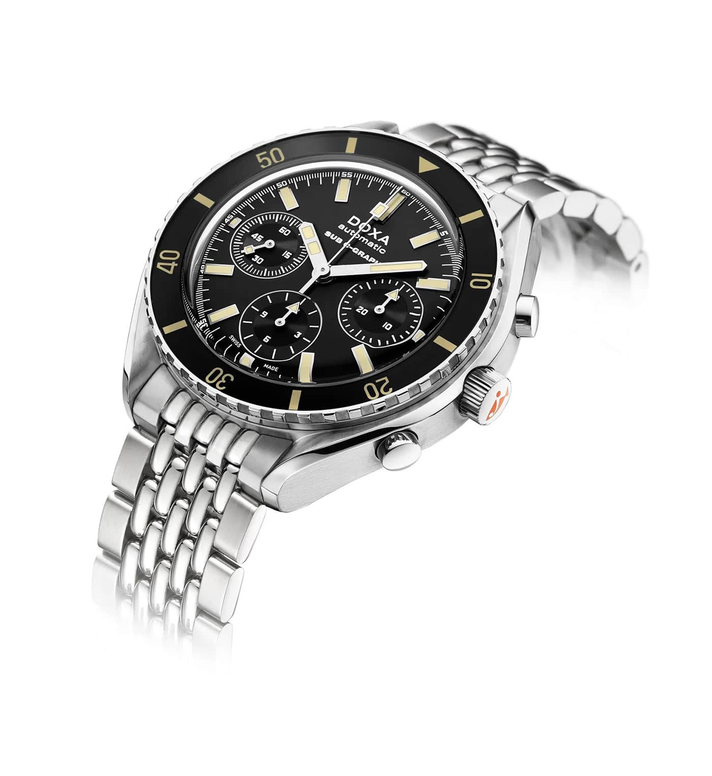 Pánské hodinky na náramku s nástavcem k obleku SUB 200 C-GRAPH se dodávají ve velké velikosti 45 mm . Celé je vyrobeno z nejkvalitnější nerezové oceli 316L a má jednosměrně otočnou lunetu se stupnicí 60 minut. Korunka je přišroubovaná a hodinky Doxa 798.10.101.10 jsou vodotěsné do 200 metrů (asi 650 stop). Všechny informace relevantní pro potápění a ve tmě jsou opatřeny luminiscenční vrstvou Super-LumiNova® pro optimální čitelnost za snížené viditelnosti na souši i pod vodou. Skládací spona hodinek s diverským chronografem DOXA obsahuje exkluzivní symbol ryby Doxa.