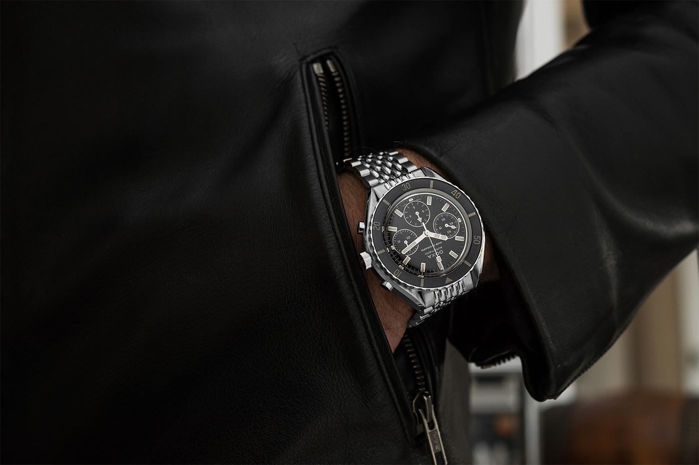 DOXA SUB 200 C-GRAPH Sharkhunter jsou profesionální diverské hodinky s černým ciferníkem a pevným pouzdrem z nerezové oceli s konstrukcí „samostatných rýžových korálků“, které drží pohromadě šrouby pro bezpečné uchycení. SUB 200 C-GRAPH je chronograficky vylepšená verze tříručičkových automatických diverských hodinek řady SUB 200. Obě kolekce se vyznačují vysoce odolným proti poškrábání a antireflexním klenutým safírovým sklem.
