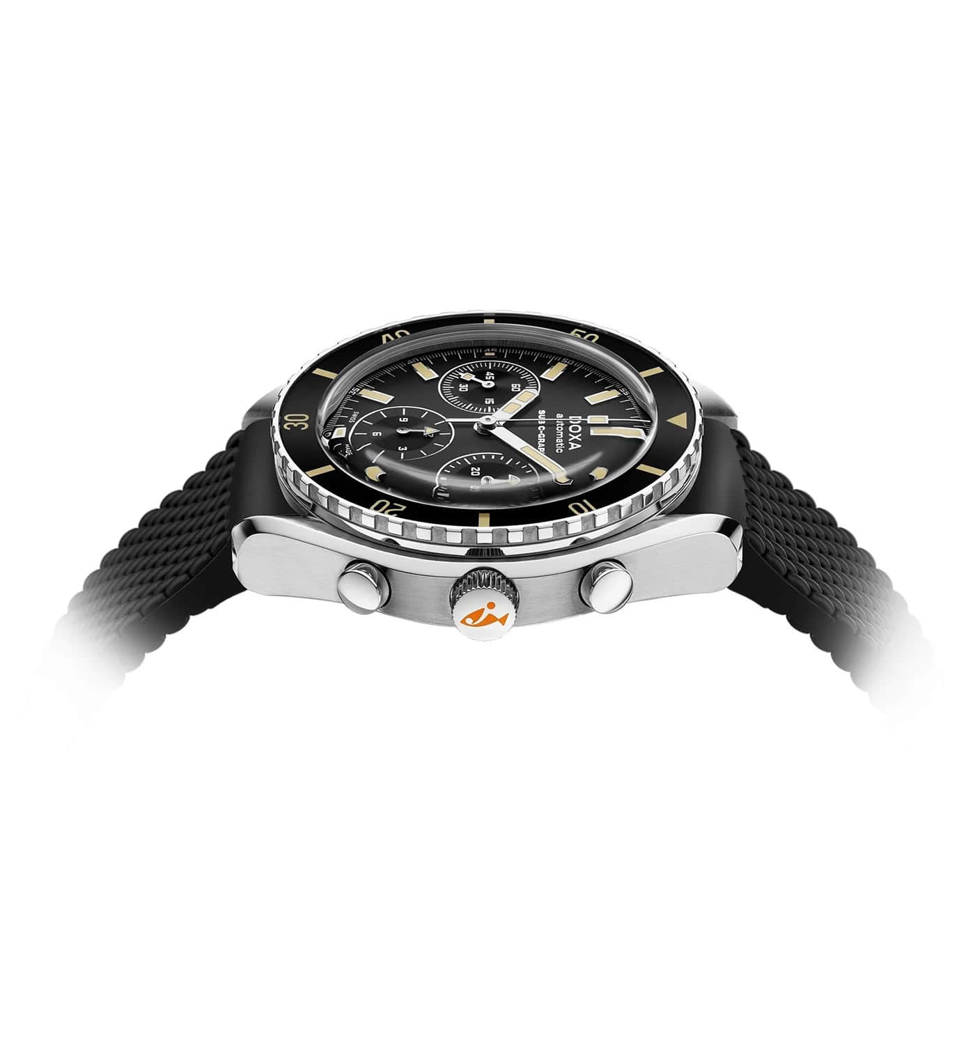 DOXA SUB 200 C-GRAPH Sharkhunter jsou profesionální diverské hodinky s černým ciferníkem, pevným pouzdrem z nerezové oceli 316L a extrémně odolným řemínkem z kvalitní FKM pryže. SUB 200 C-GRAPH je chronograficky vylepšená verze tříručičkových automatických diverských hodinek řady SUB 200. Obě kolekce se vyznačují vysoce odolným proti poškrábání a antireflexním klenutým safírovým sklem.