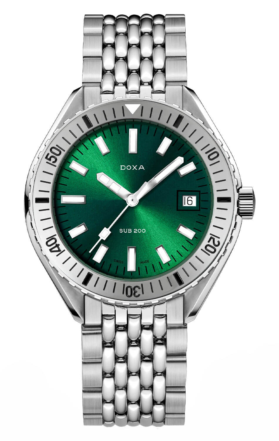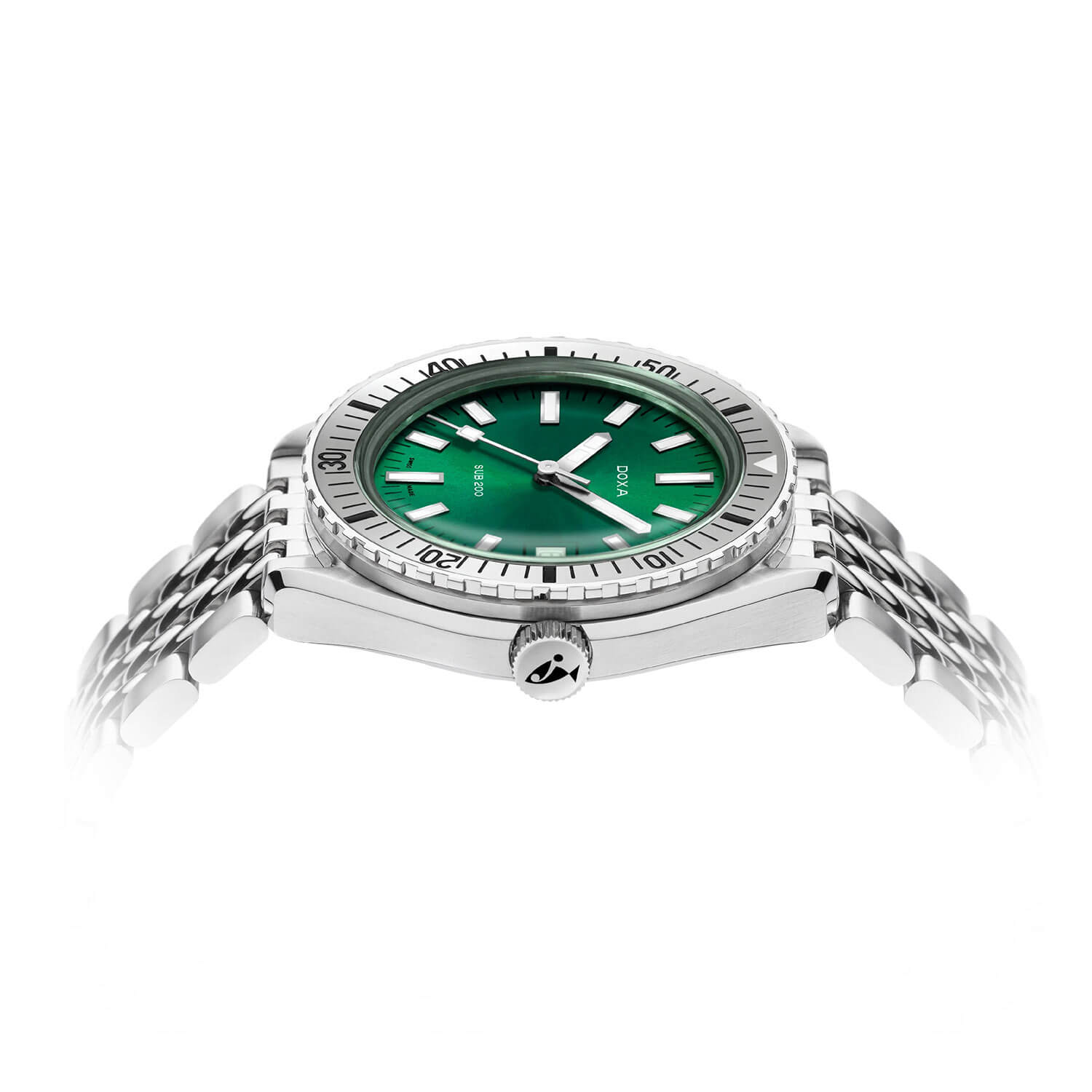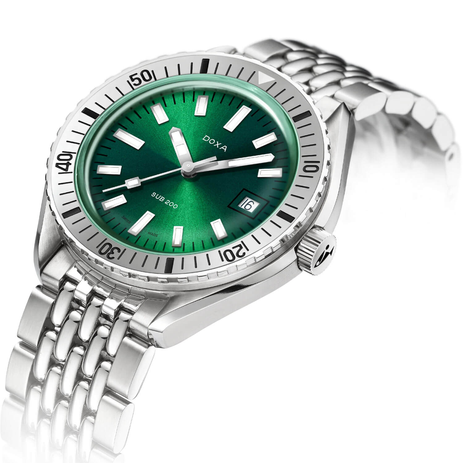 Pod safírovým sklíčkem se nachází sněhově zelený číselník. Jeho sytá barva zajišťuje maximální kontrast a viditelnost pod vodou, zatímco indexy a ručičky pokryté vrstvou Super-LumiNova® zůstávají čitelné i ve tmě. Na třetí hodině je umístěno datumové okénko v rámečku, které nenarušuje harmonii celkového designu. Potápěčské hodinky Doxa SUB Automatic 7961013110 na náramku nejsou určeny do vitríny – jsou to poctivé diverky připravené k akci.