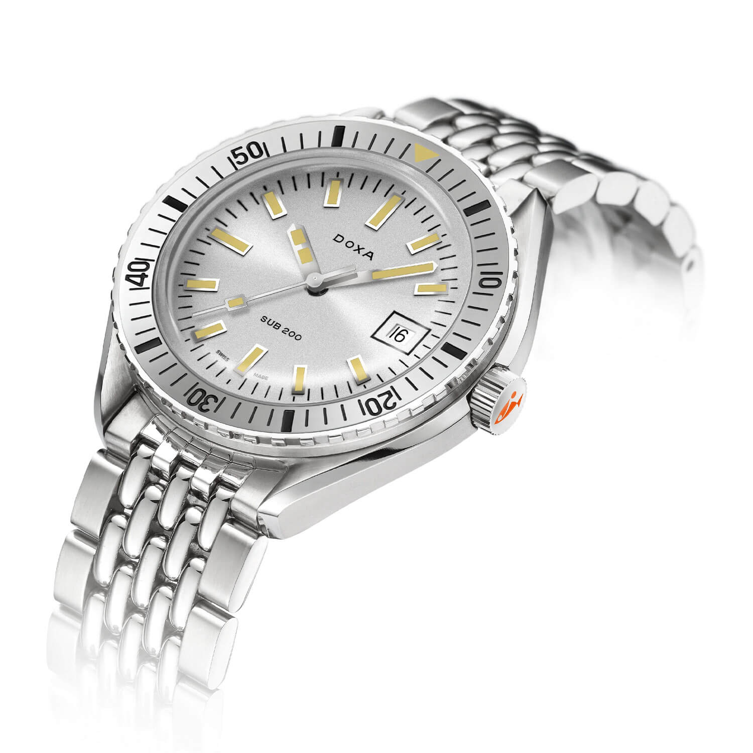 Pod safírovým sklíčkem se nachází stříbrný číselník – odstín, který umožňuje rychlé odečtení aktuálního času. Jeho barva poskytuje vysoký kontrast a výbornou viditelnost pod vodou, zatímco indexy a ručičky pokryté vrstvou Super-LumiNova® zůstávají čitelné i ve tmě. Na třetí hodině se nachází datumové okénko v rámečku, které nenarušuje harmonii celkového designu. Potápěčské hodinky Doxa SUB Automatic 7961002110 na náramku nejsou určeny do vitríny – jsou to poctivé diverky připravené k akci.