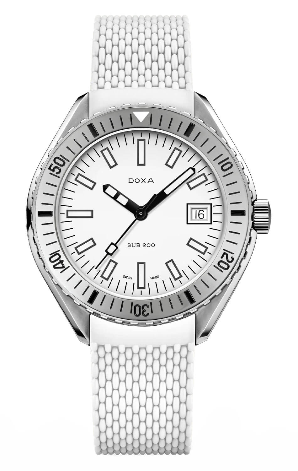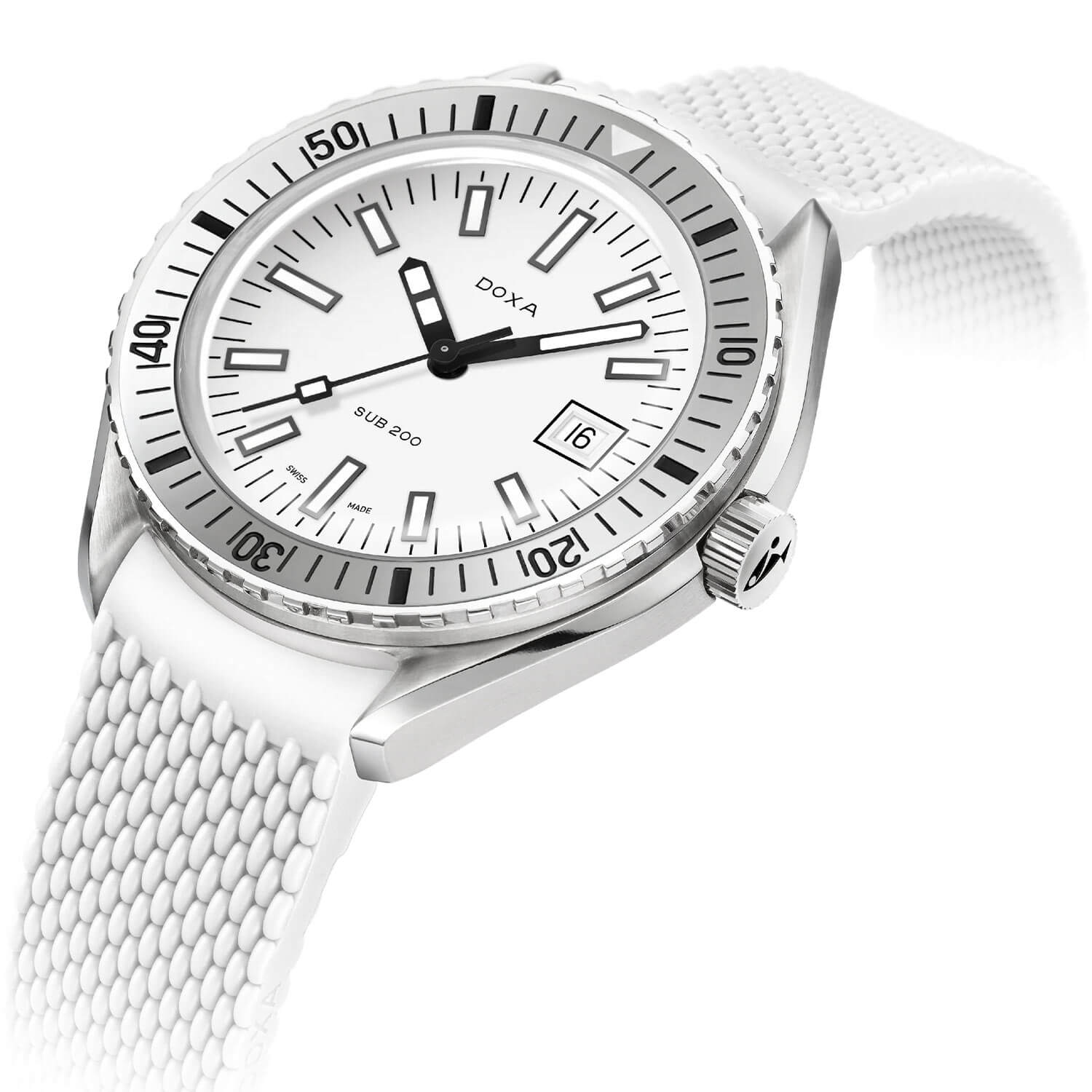 Bílý číselník zde nebyl použit náhodou – tato barva zajišťuje vysoký kontrast pod vodou. Díky použití indexů a ručiček pokrytých vrstvou Super-LumiNova® zůstávají hodinky čitelné i v naprosté tmě. Na pozici třetí hodiny je umístěno decentní datumové okénko v rámečku, které harmonicky doplňuje kompozici ciferníku. Tyto hodinky nebyly stvořeny proto, aby přitahovaly pohledy ve vitrínách – potápěčské hodinky Doxa SUB 200 Automatic 796.10.011.23 na gumovém řemínku jsou nástroj určený k akci, ne k pózování.