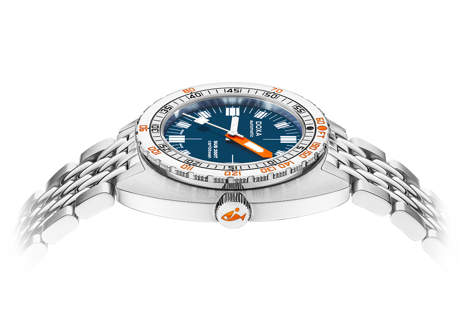 Pánské automatické hodinky Doxa SUB 200T Caribbean 8041020110 vynikají tvarem soudku (tonneau) o velikosti 39 mm. SUB 200T si dovedně zachovává veškerou DNA původních hodinek SUB a zároveň přijímá moderní styl a sofistikovanost díky svému menšímu průměru. Na pravé straně je šroubovací korunka s logem ryby. Na rubu je pevně přišroubované víko, které v kombinaci s korunkou vytváří dokonalou těsnost mimo jiné proti vodě a prachu. Vodotěsnost těchto diverských hodinek je hodnocena na 200 metrů (20 ATM). Umožní vám potápět se s hodinkami bez obav z jejich poškození. K tomuto modelu se snoubí charakteristický náramek z ocelových "rýžových korálků" s bezpečným motýlkovým zapínáním. Hodinky jsou vybaveny přesným automatickým mechanismem s rezervou chodu až 38 hodin.