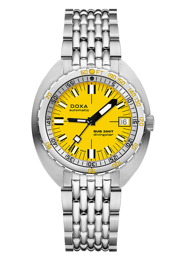 Značka DOXA upravila design ciferníku, aby dosáhla modernějšího vzhledu na zápěstí. Ciferník je chráněn safírovým sklem odolným proti poškrábání s antireflexní vrstvou a je dostupný ve žluté barvě. Všechny metriky související s potápěním byly mírně vylepšeny. Minutová ručička je zvětšená, což usnadňuje sledování ubíhajícího času při ponoření. Hloubková stupnice na patentované otočné lunetě v kombinaci s ručičkami je nejen skvěle čitelná, ale také zajišťuje bezpečnost každého divere. Ručičky a indexy mají povrchovou úpravu Super-LumiNova® pro optimální čitelnost i za špatných světelných podmínek. Pánské hodinky Doxa SUB 200T jsou stylové, sportovní a pevné hodinky pro sofistikovaného gentlemana. Bude dokonalým doplňkem každého elegantního i sportovního šatníku.