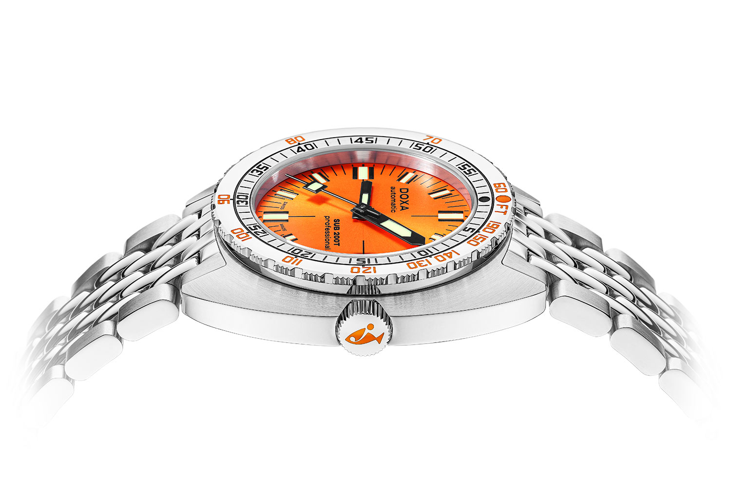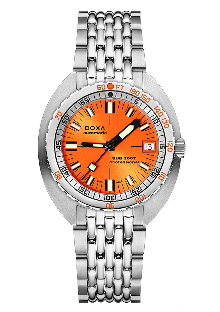 Značka DOXA upravila design ciferníku, aby dosáhla modernějšího vzhledu na zápěstí. Ciferník je chráněn safírovým sklem odolným proti poškrábání s antireflexní vrstvou a je k dispozici ve světle oranžové barvě. Všechny metriky související s potápěním byly mírně vylepšeny. Minutová ručička je zvětšená, což usnadňuje sledování ubíhajícího času při ponoření. Hloubková stupnice na patentované otočné lunetě v kombinaci s ručičkami je nejen skvěle čitelná, ale také zajišťuje bezpečnost každého divere. Ručičky a indexy mají povrchovou úpravu Super-LumiNova® pro optimální čitelnost i za špatných světelných podmínek. Pánské hodinky Doxa SUB 200T jsou stylové, sportovní a pevné hodinky pro sofistikovaného gentlemana. Bude dokonalým doplňkem každého elegantního i sportovního šatníku.